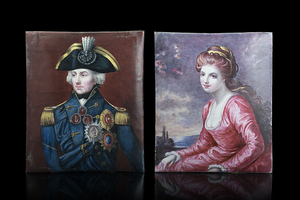 A pair of paintings on enamelled copper plates portraying Admiral Horatio Nelson and Lady Hamilton