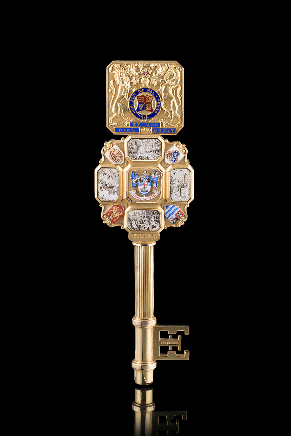 La chiave presenta nella sua parte alta lo stemma del Regno Unito con smalti e motti.