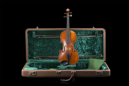 One-piece back of bird’s eye maple, varnish of a golden red colour, fair condition, labelled «RAFFAELE ED ANTONIO GAGLIANO / FECE IN NAPOLI 1850» (lenght of back mm 355). With double case and two bows, one of them by Homa
