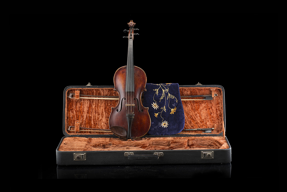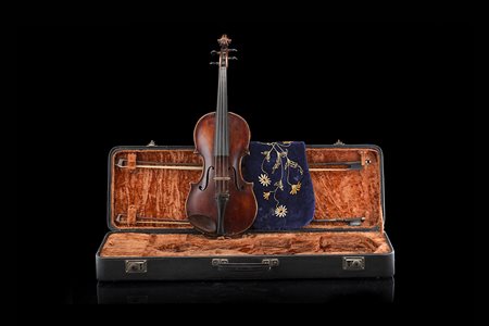 Two-piece back of light curl, varnish probably not origina of a red brown colour, fair condition, labelled «Giovanni Piva / Fece in Genova ne 1888 / Via Madre di Dio 22,14» (lenght of back mm 357). With case and two bows