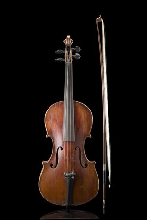 Fondo in due pezzi con marezzatura media, vernice di colore rosso bruno, in discrete condizioni, scritta a matita interna "Onorati Mario / RIPARATO 1946 / LIVORNO". Con arco (lunghezza della cassa mm 358)