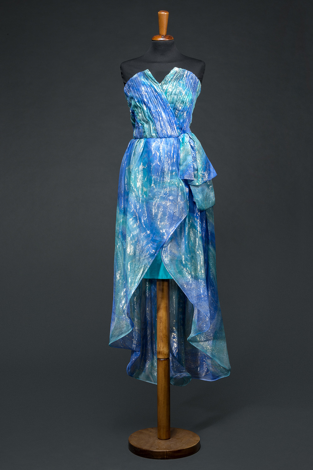 Vestito lungo senza maniche in tessuto lamé nei toni del bluette e turchese (tg. 44)