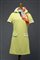 Vestito estivo vintage in maglia verde acido bordato di bianco unito ad un foulard in seta, fondo crème, bordo arancione con disegno "jungle"
