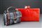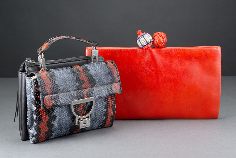 Lotto di due borse in pelle, una in finto rettile nei toni del blu, rosso, nero e una pochette con tracolla color rosso e arancione, entrambe con custodia originale