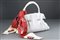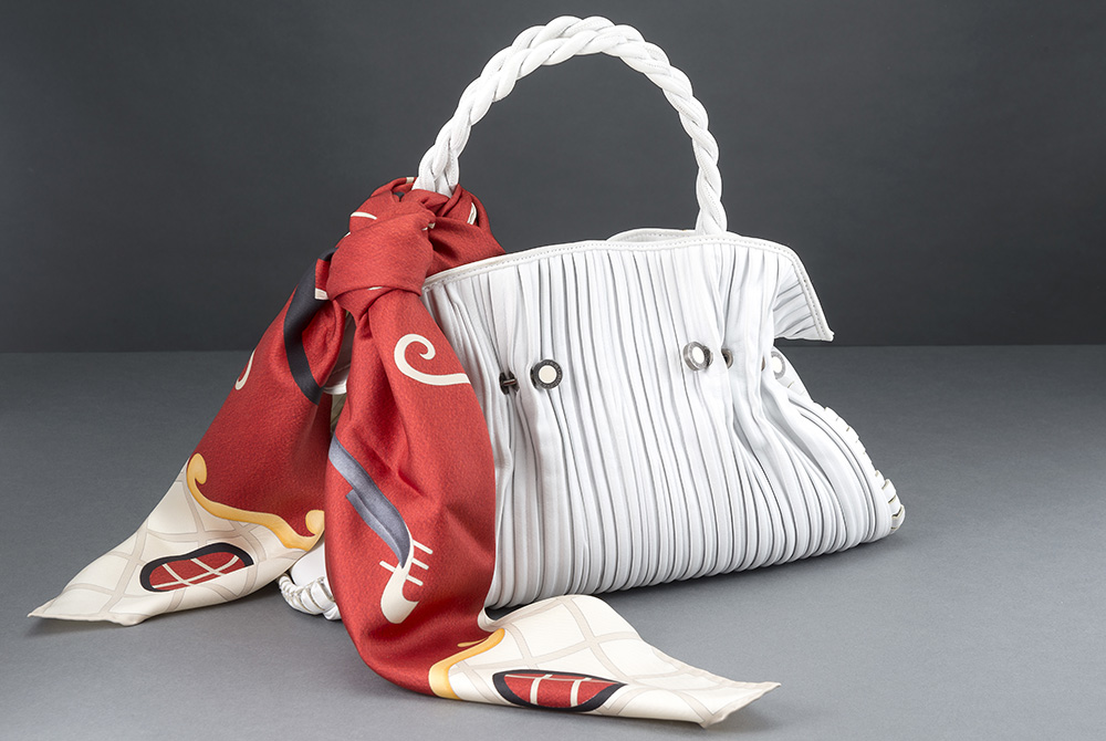 Lotto composto da foulard e borsa in pelle bianca con doppio manico, inserti in metallo logato, sacchetto originale (cm 34)