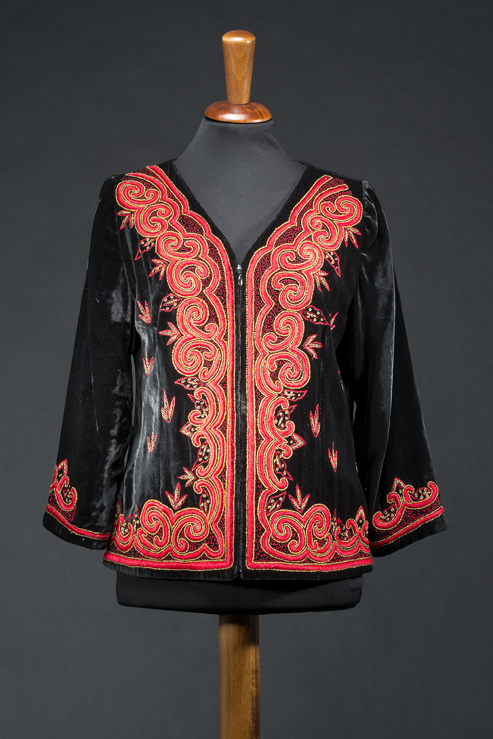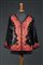 Giacca in velluto nero con chiusura a cerniera, scollo a V e ricamo in passamaneria sui toni del rosso e oro (tg. 42)