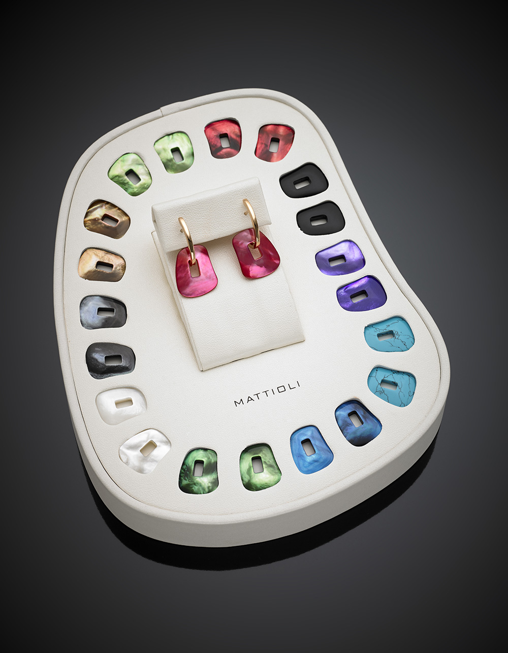 Orecchini in oro rosso con pendenti intercambiabili in simil-madreperla di svariati colori, collezione "Puzzle", in confezione originale con certificato di garanzia