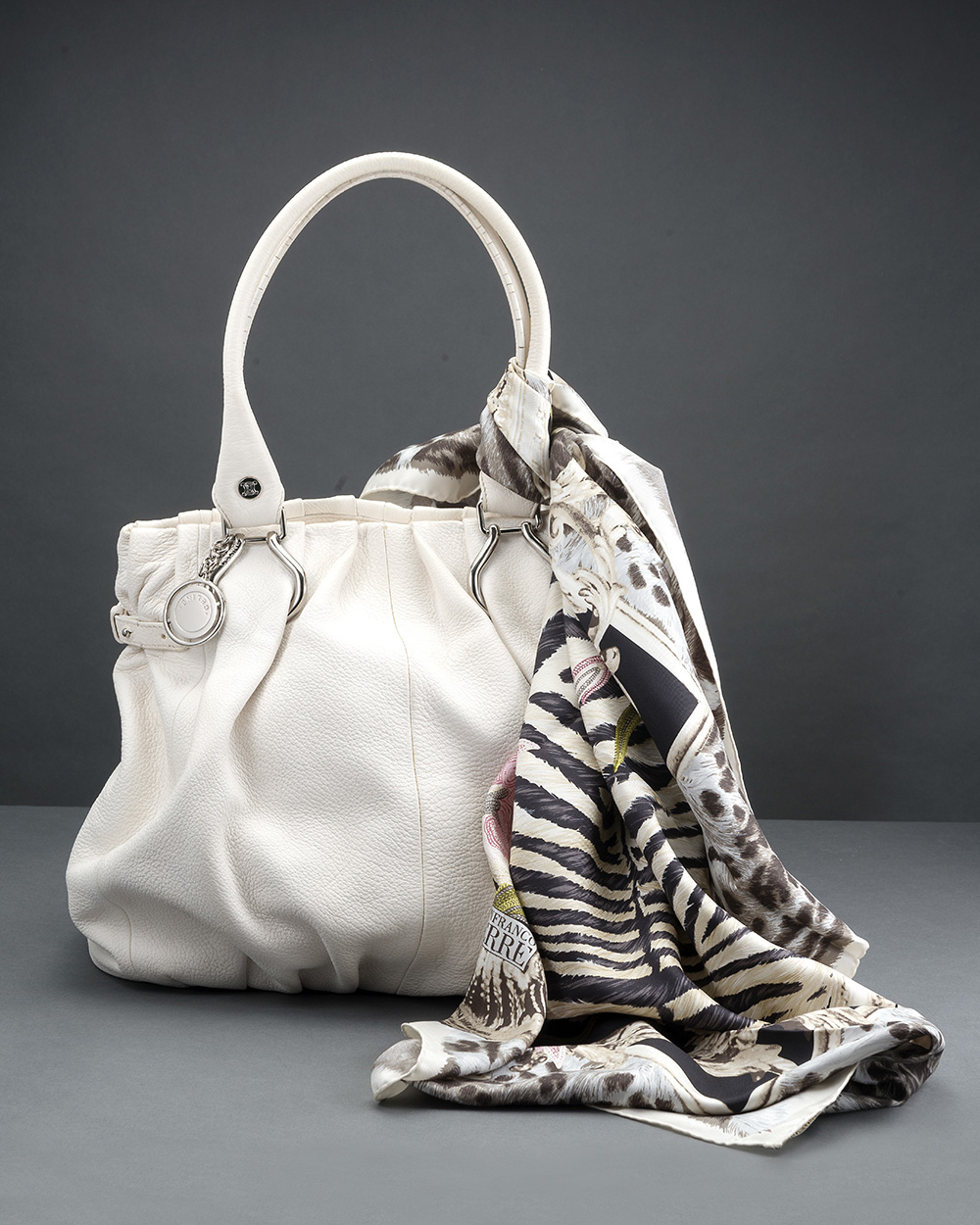 Lotto composto da una borsa in pelle bianca a due manici e un foulard in seta