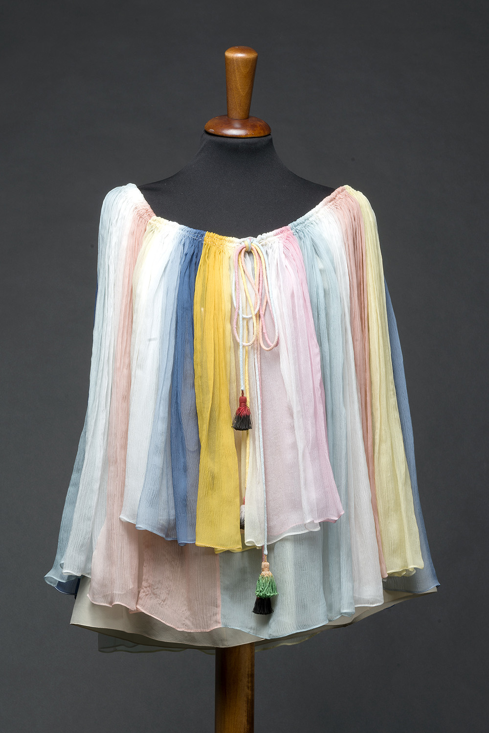 Camicia a poncho in chiffon di seta di vari colori rifinita con motivo a nappe (tg. 34 francese)