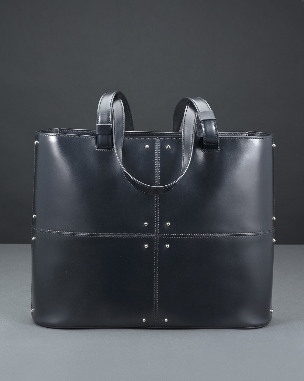 Borsa in pelle nera a doppio manico con borchiette color nichel, sacchetto originale (cm 37)