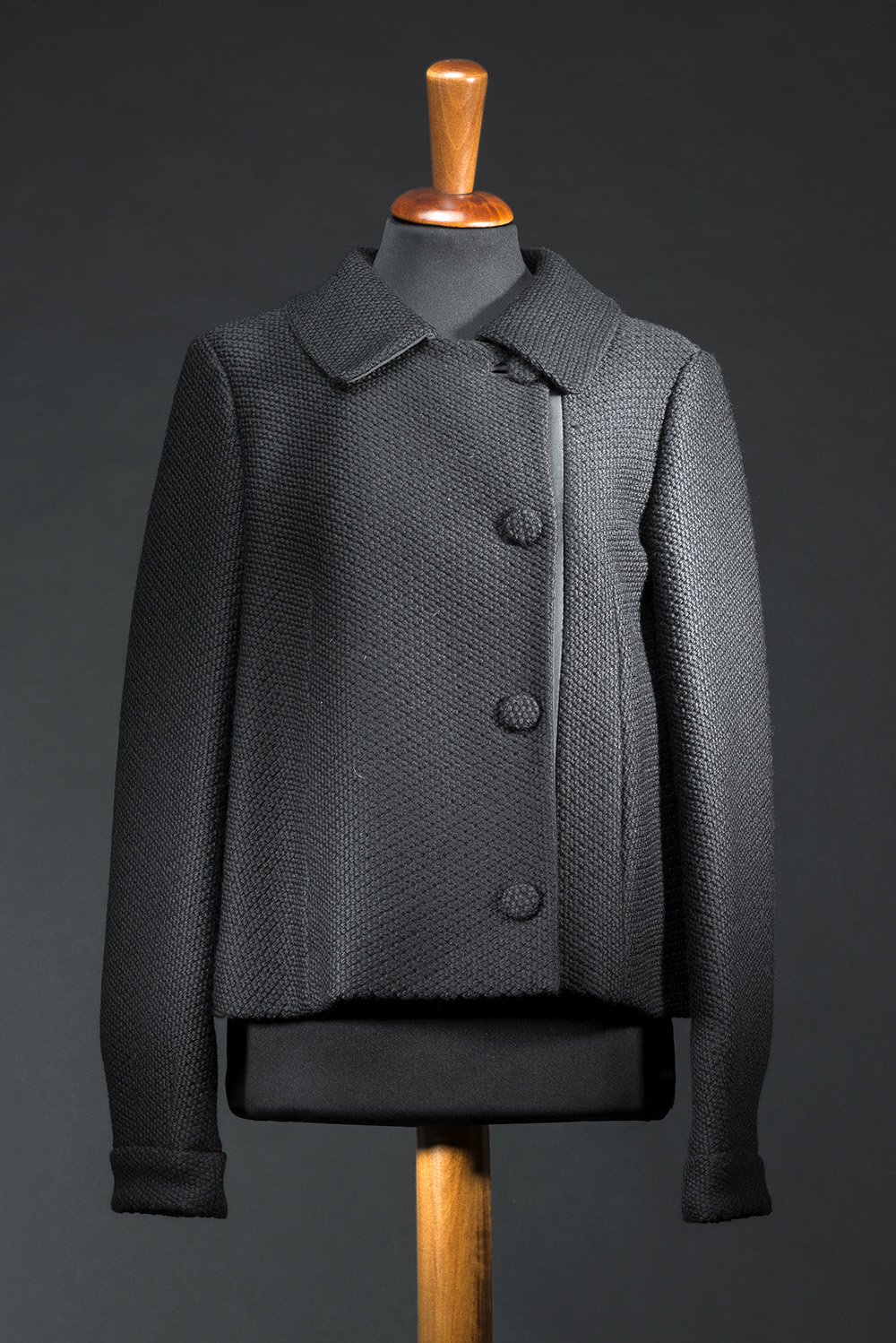 Giacchino nero in lana operata e tessuto tecnico con chiusura laterale (tg. 36 francese)
