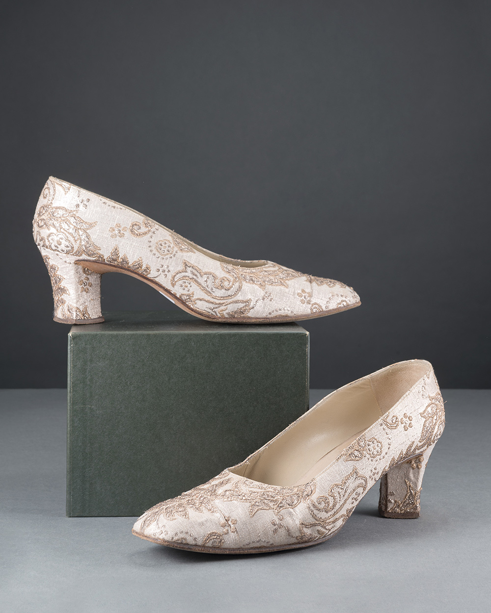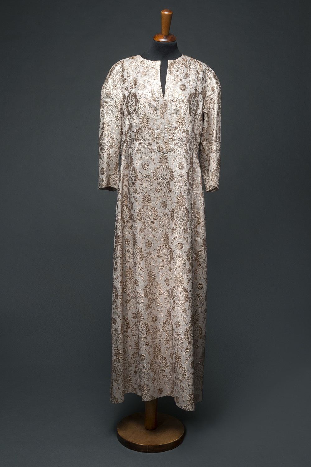 Lotto composto da un caftano in tessuto lamé damascato a disegno rinascimentale con scarpe in pendant (tg. caftano 44 e scarpe 38.5)