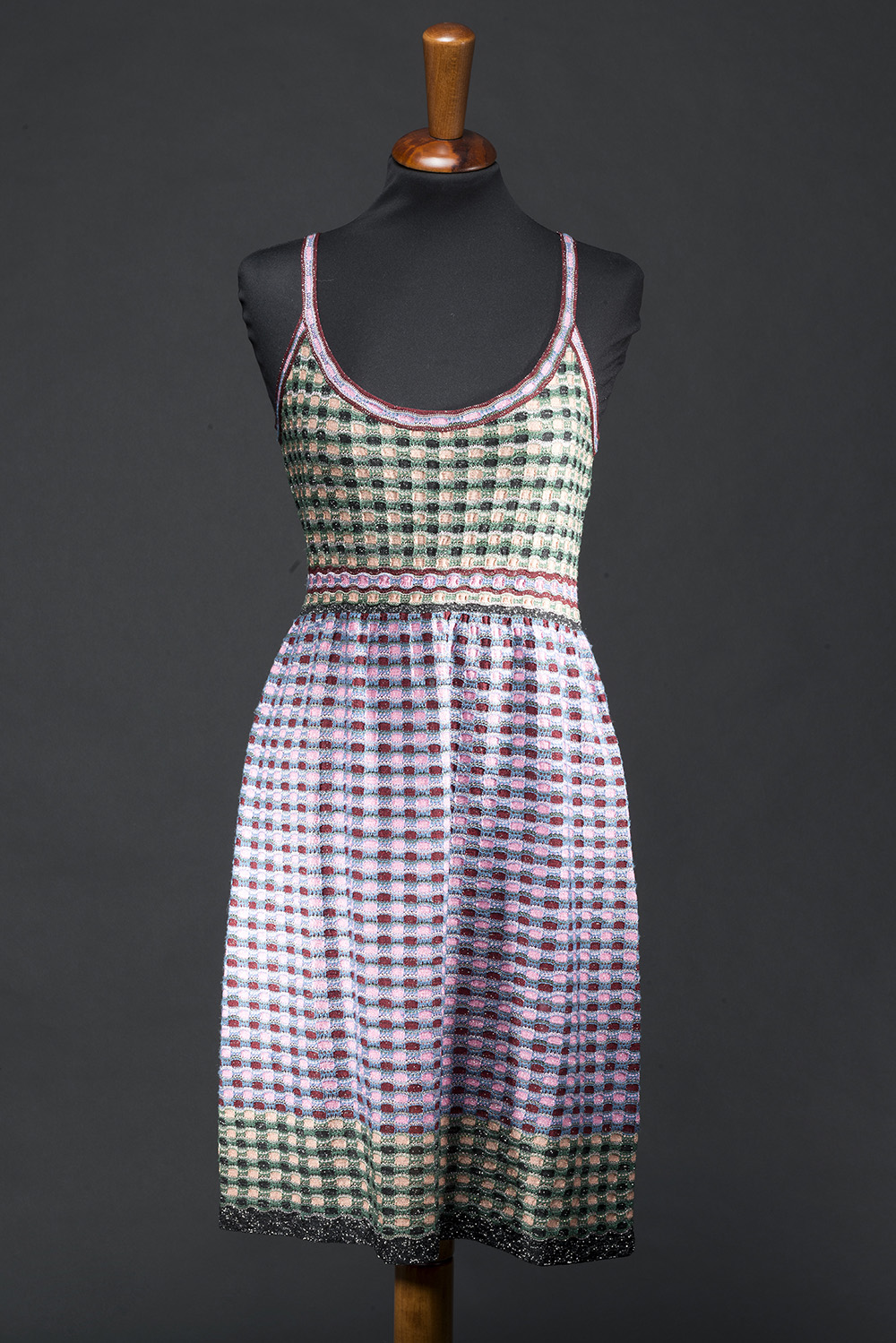 Abito sottoveste in maglina multicolor con uno dei suoi classici motivi, rifinito con fili in lamé argento (tg. 40)