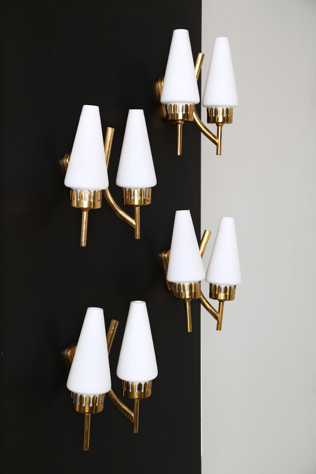 MANIFATTURA ITALIANA Quattro applique in ottone e vetro satinato, anni 50. -....
