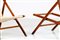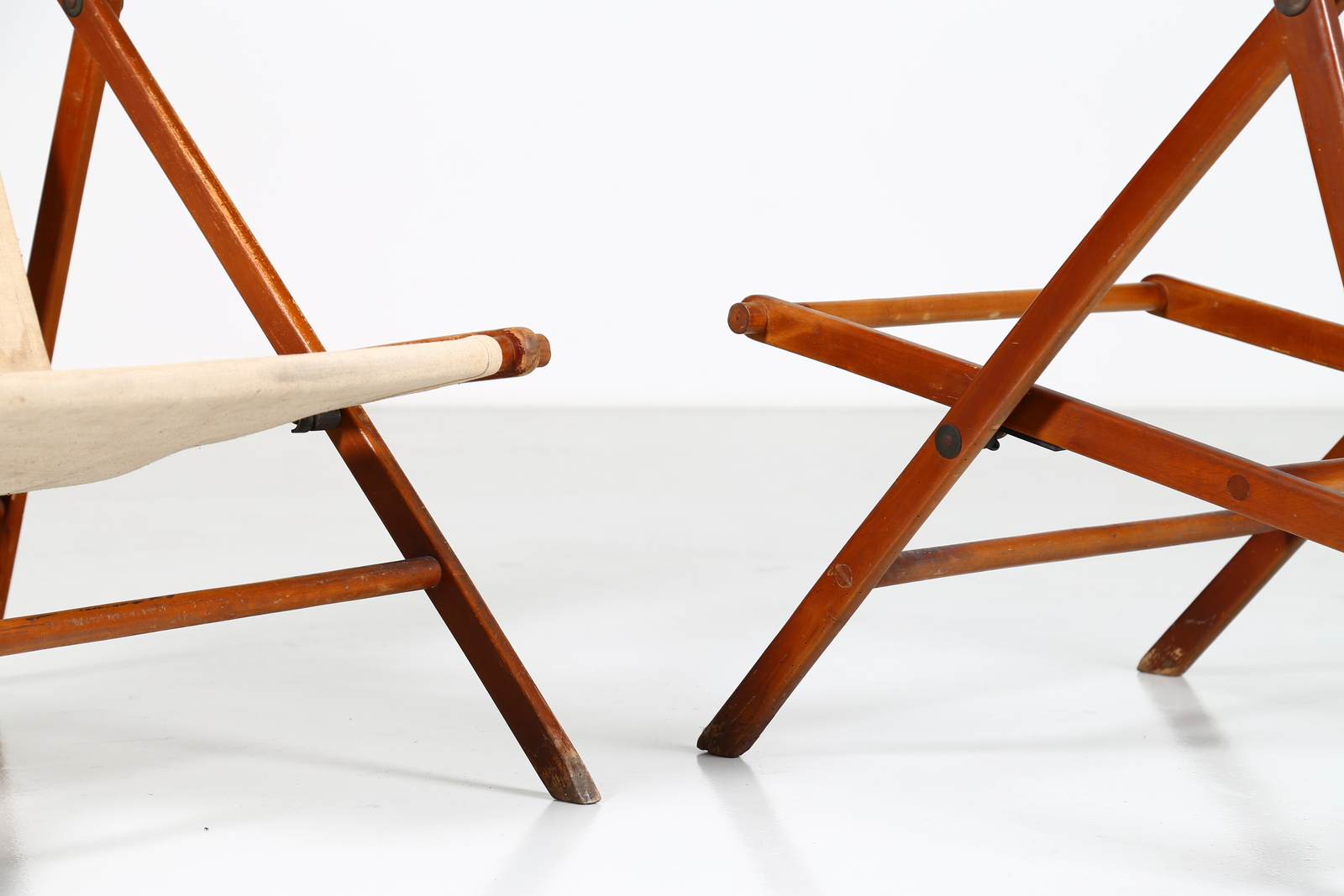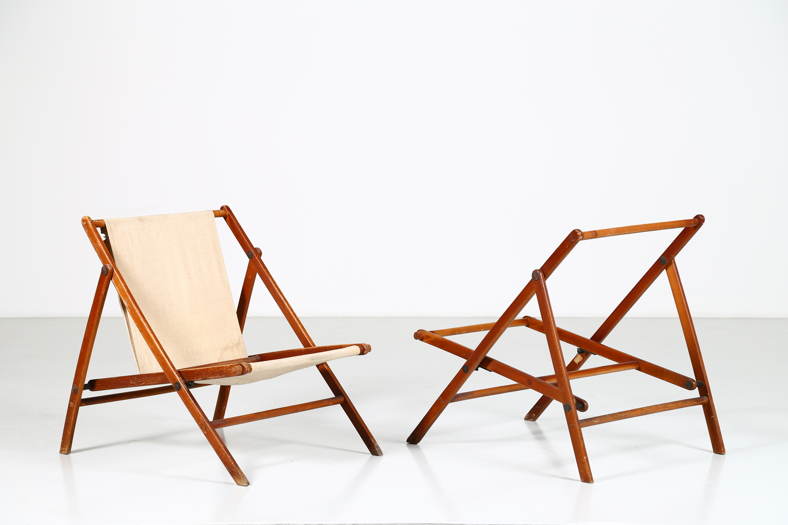 MAGISTRETTI VICO (1920 - 2006) Pair of wood and fabric deckchairs, mod. Piccy for Campeggi, 1970s. . Cm 71,00 x 83,00 x 90,00.