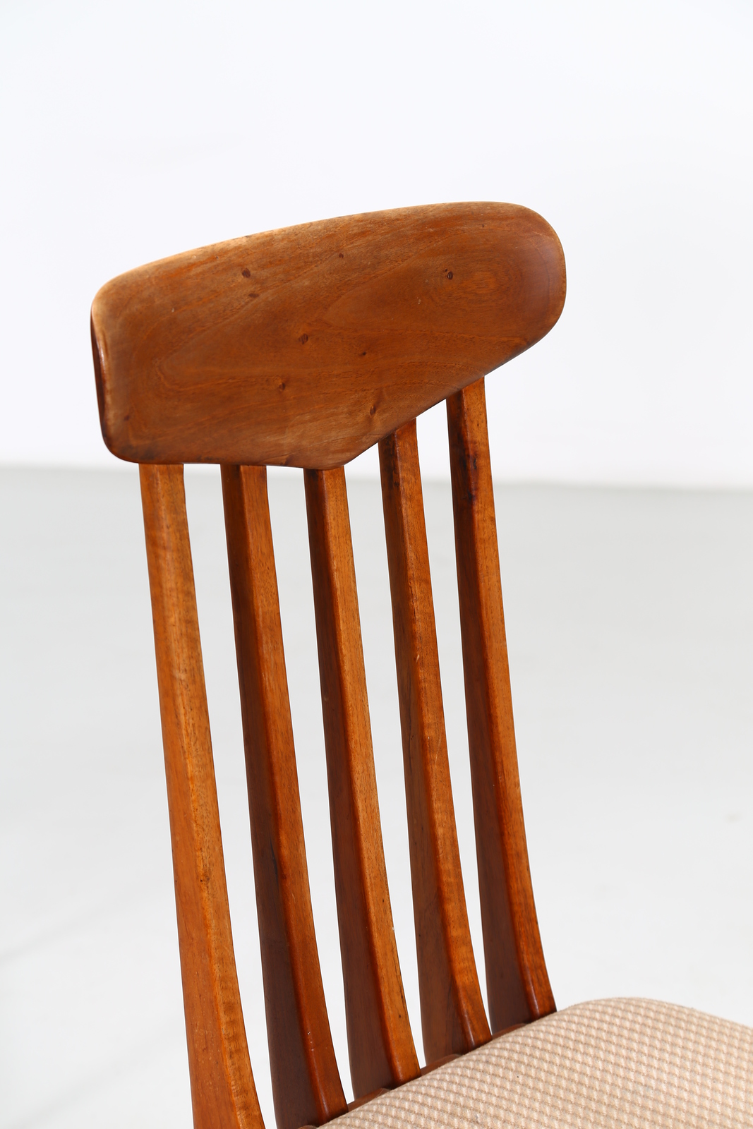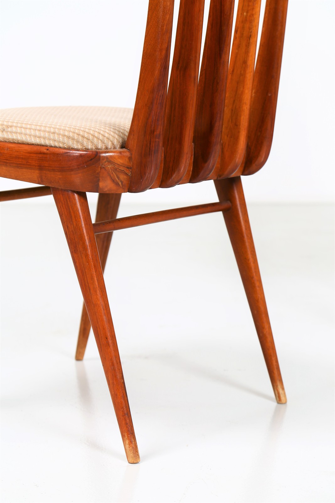 ANONIMO Quattro sedie in noce e tessuto, anni 40, Pubblicazioni; Il mobile italiano degli anni '40 e '50 di Irene De Guttry, Maria Paola Maino, pag. 25, fig. 20. -. Cm 45,00 x 99,00 x 50,00.
