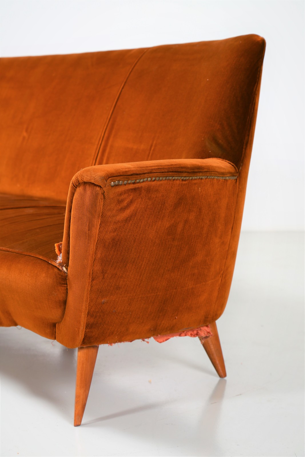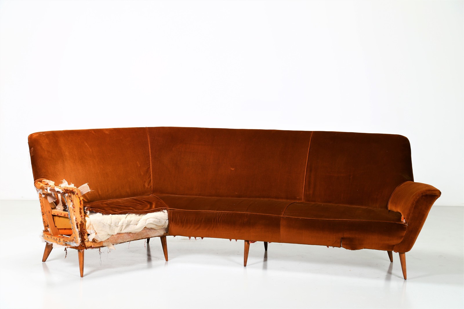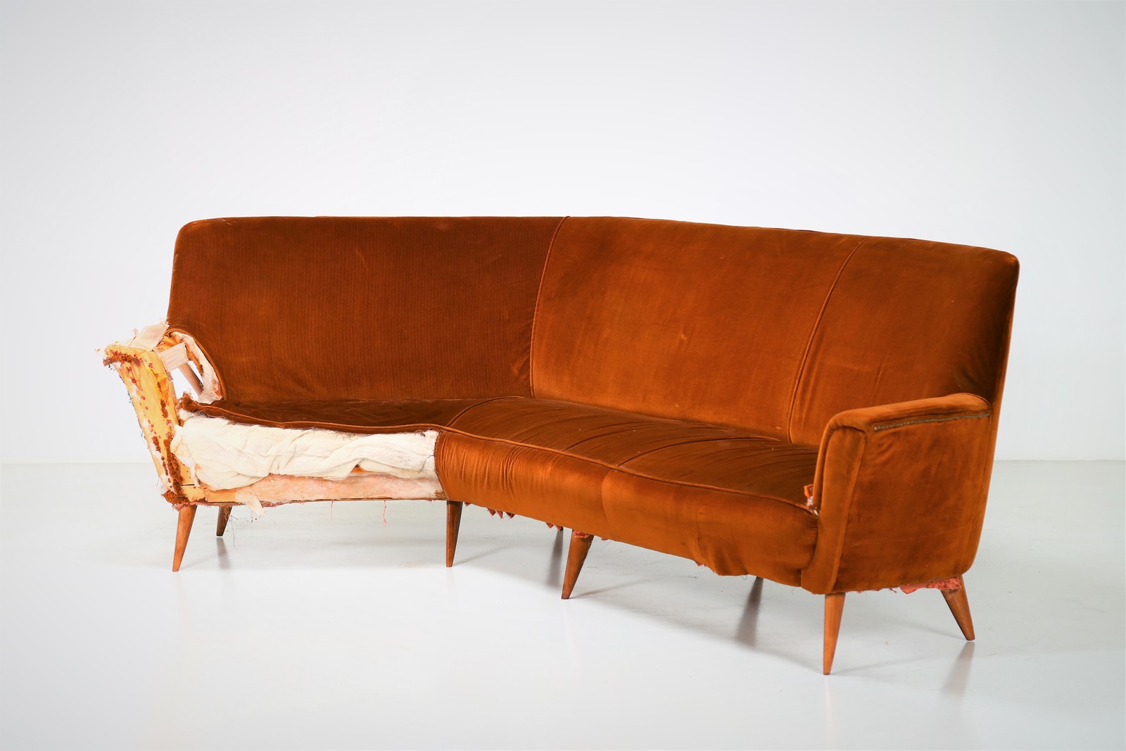 PARISI ICO (1916 - 1996) Attrib. Wood and fabric corner sofa, 1950s. . Cm 283,00 x 92,00 x 140,00.
