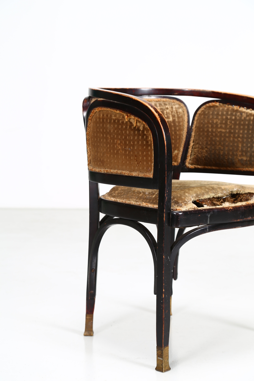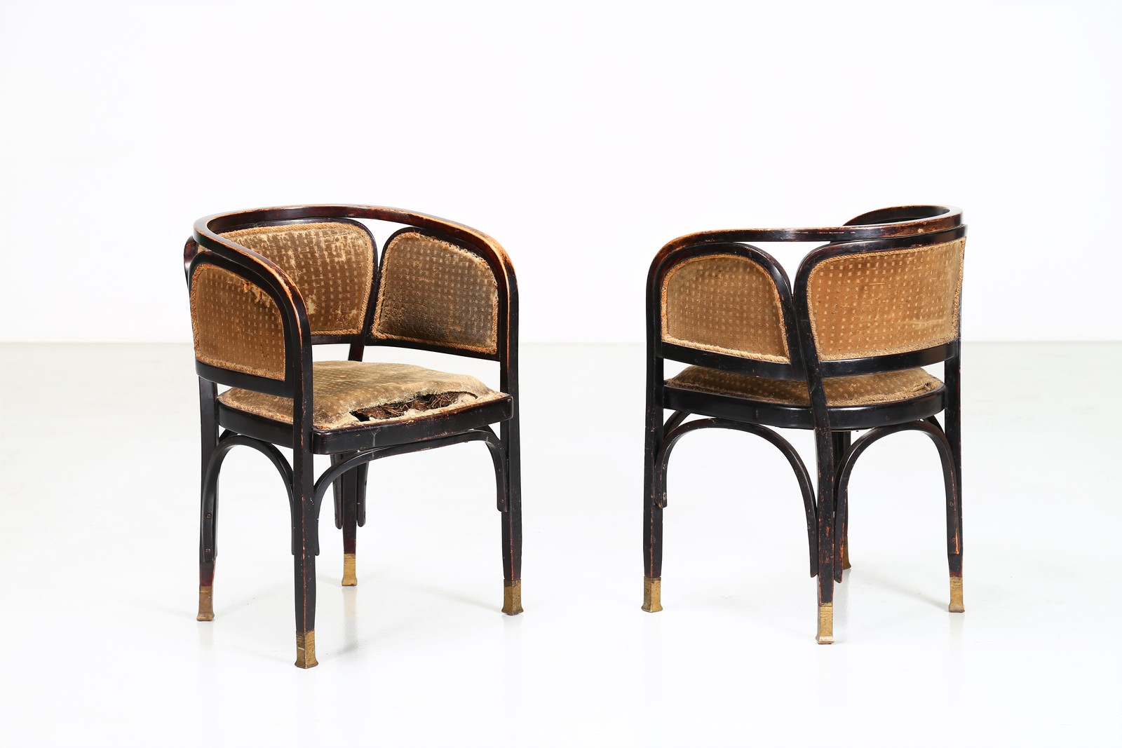 SIEGEL GUSTAV (1880 - 1970) Pair of wood, brass and original fabric easy seats, mod. 715 for Kohn, early 1900s . . Cm 50,00 x 76,00 x 46,00.