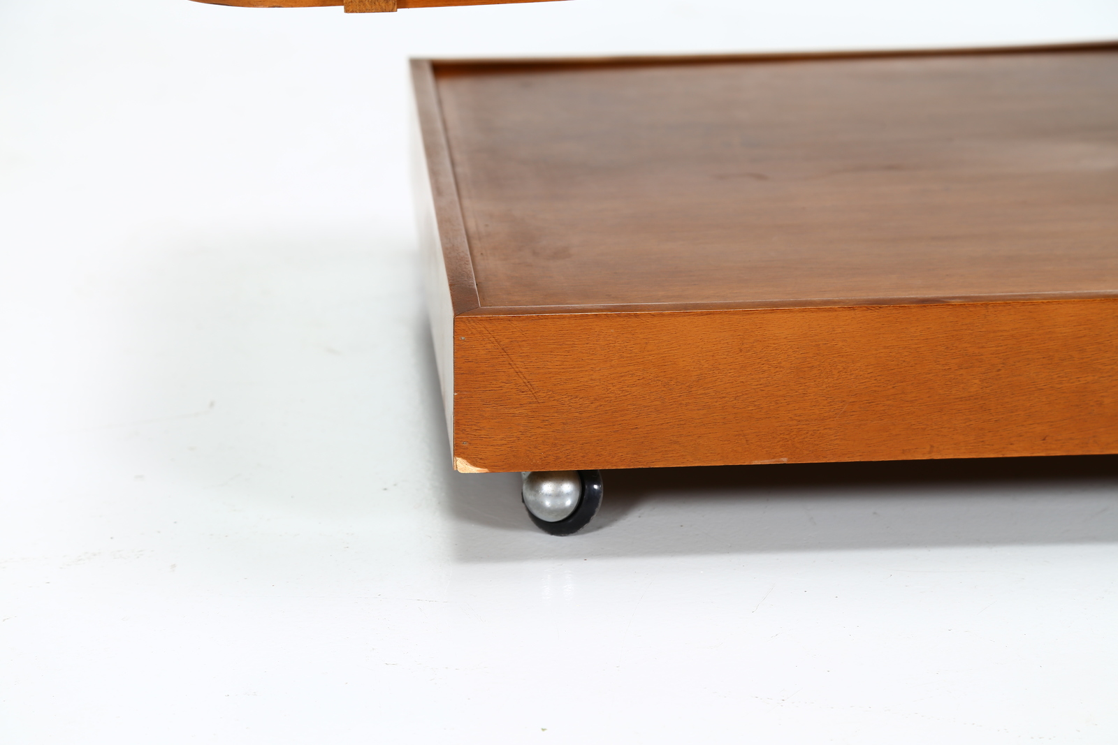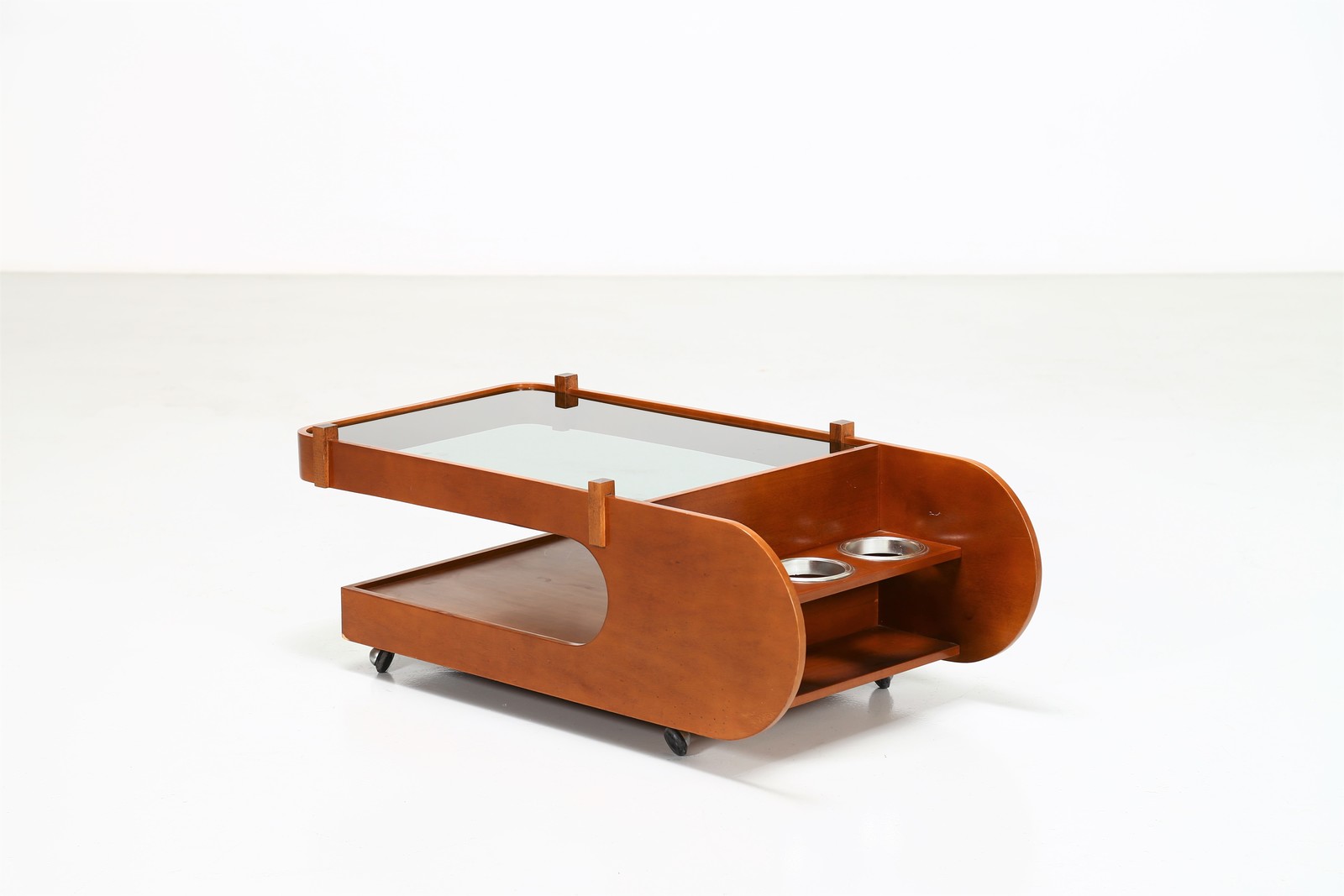 ITALIAN MANUFACTURE Wood and aluminium coffee table and bar, 1970s. . Cm 95,00 x 33,00 x 59,00.