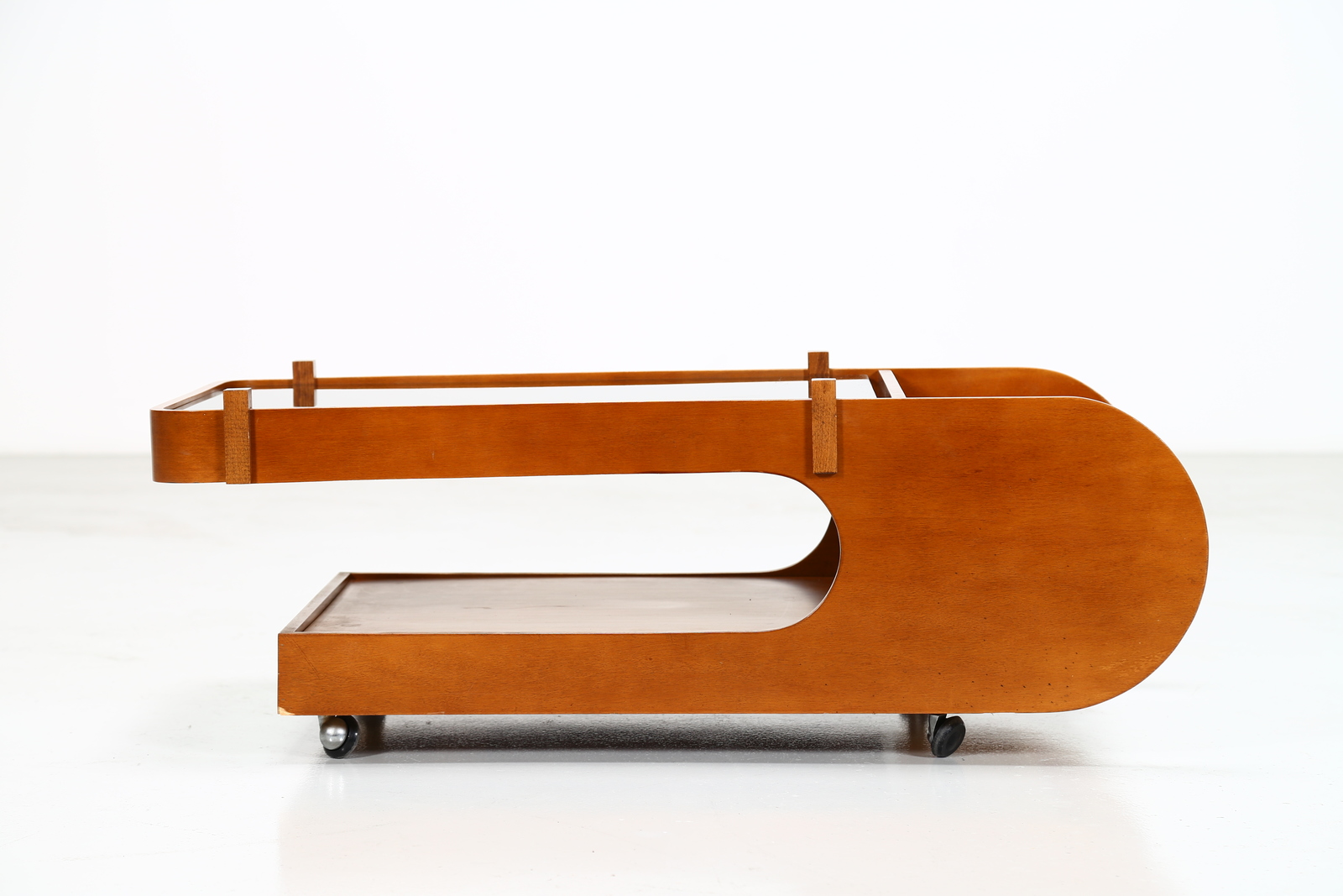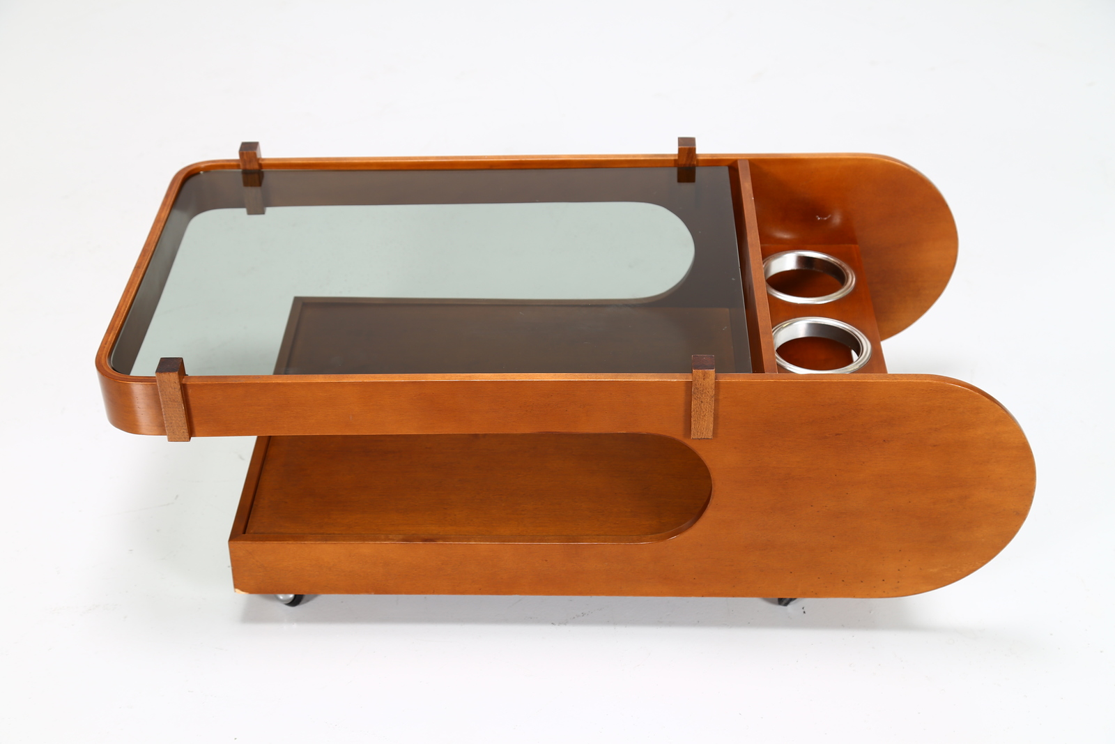 MANIFATTURA ITALIANA Tavolino da caffè e bar, in legno alluminio e vetro, anni 70. -. Cm 95,00 x 33,00 x 59,00.