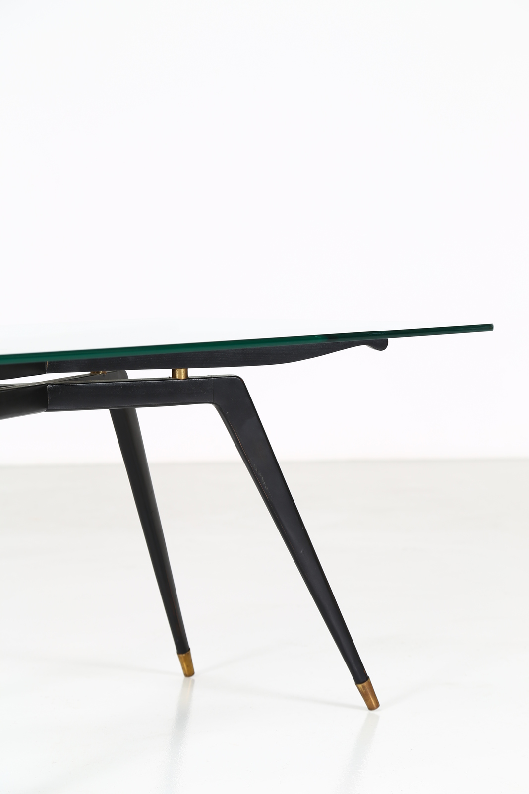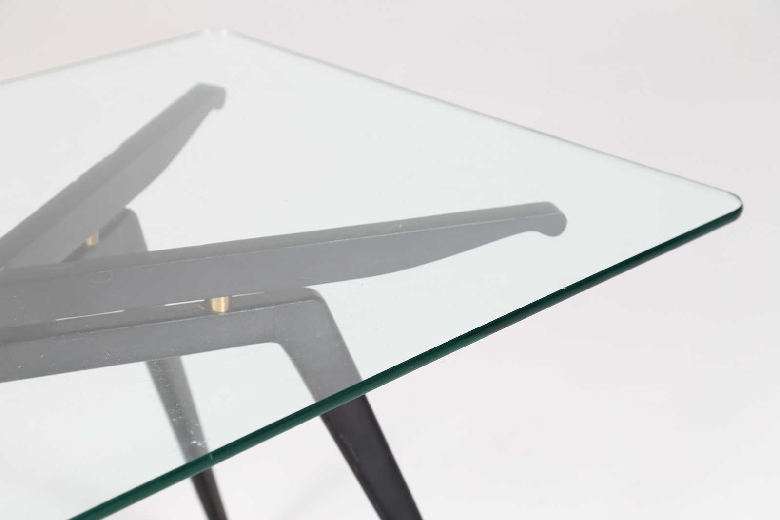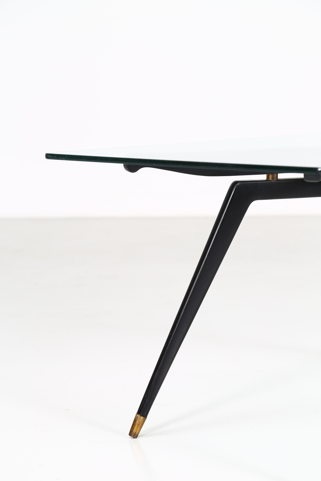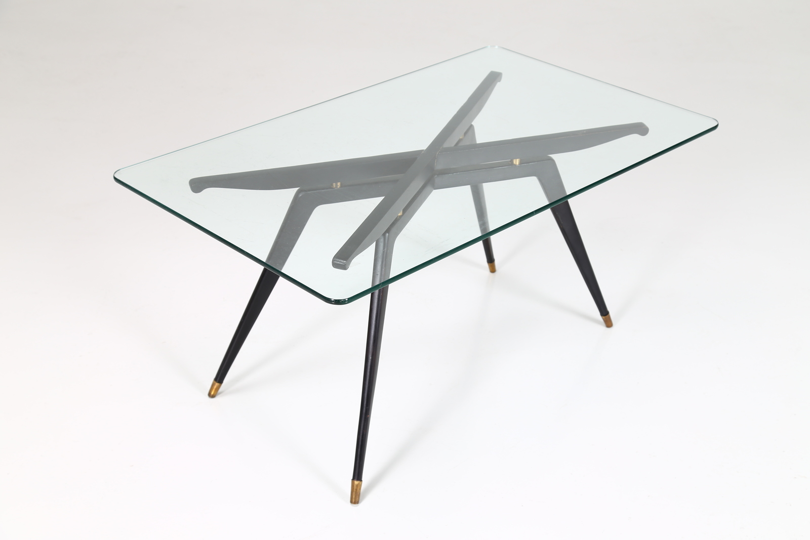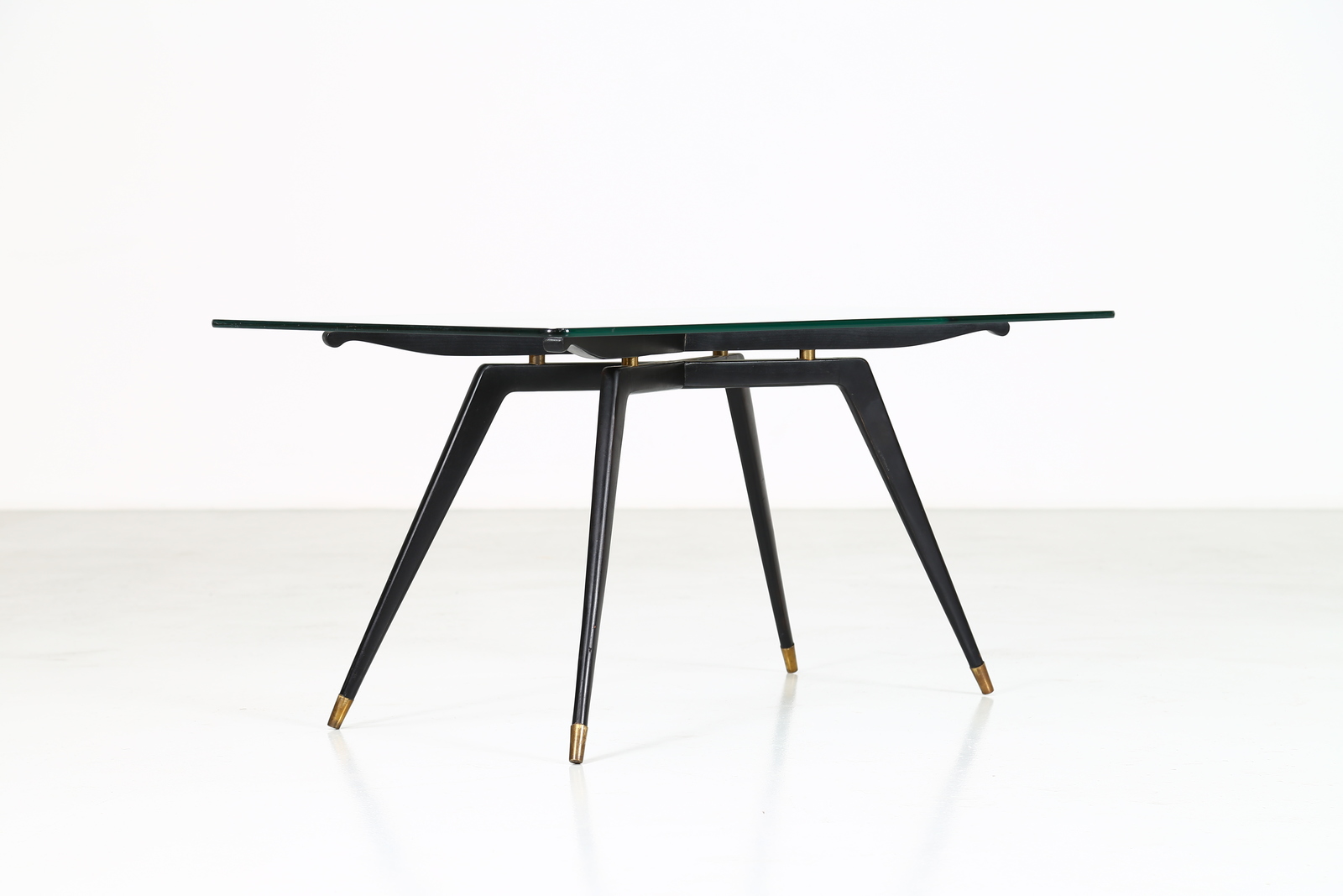 MANIFATTURA ITALIANA Tavolino in legno laccato, piano in vetro e dettagli in ottone, anni 50. -. Cm 100,00 x 49,50 x 60,00.