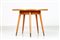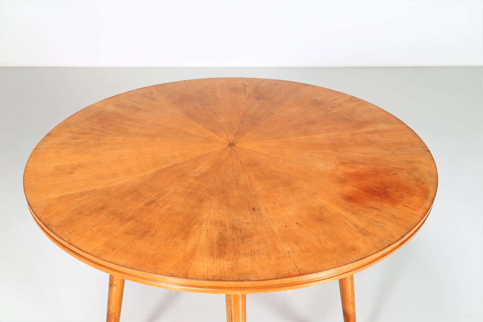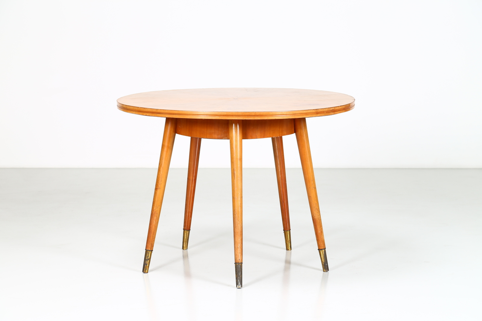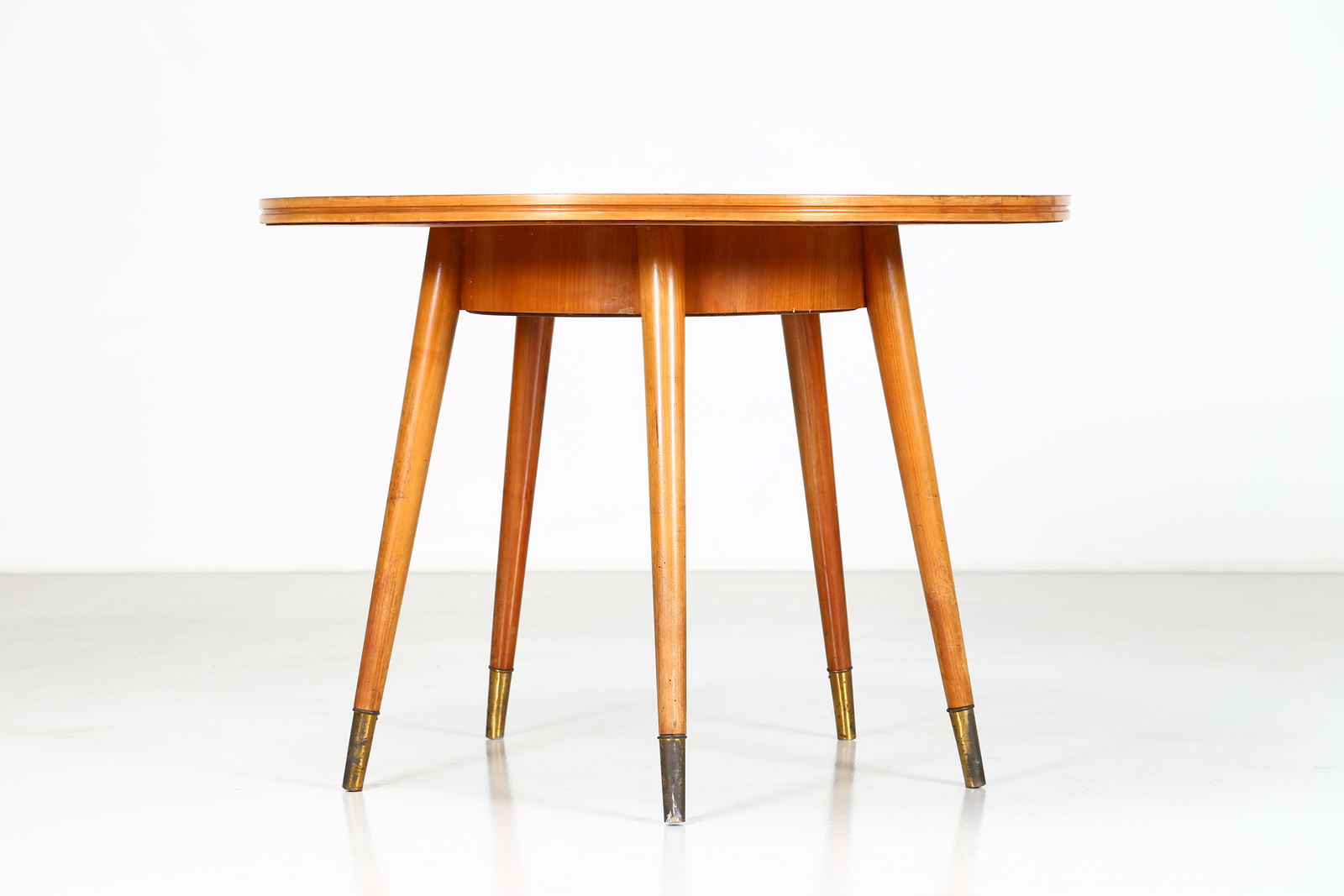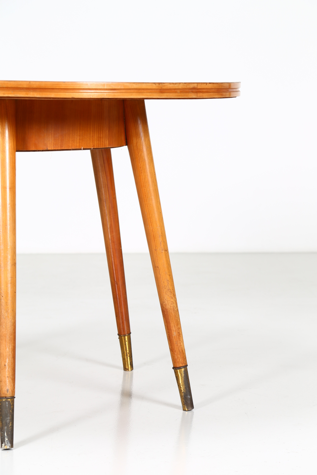 MANIFATTURA ITALIANA Tavolo tondo in ciliegio con puntali in ottone, anni 50....
