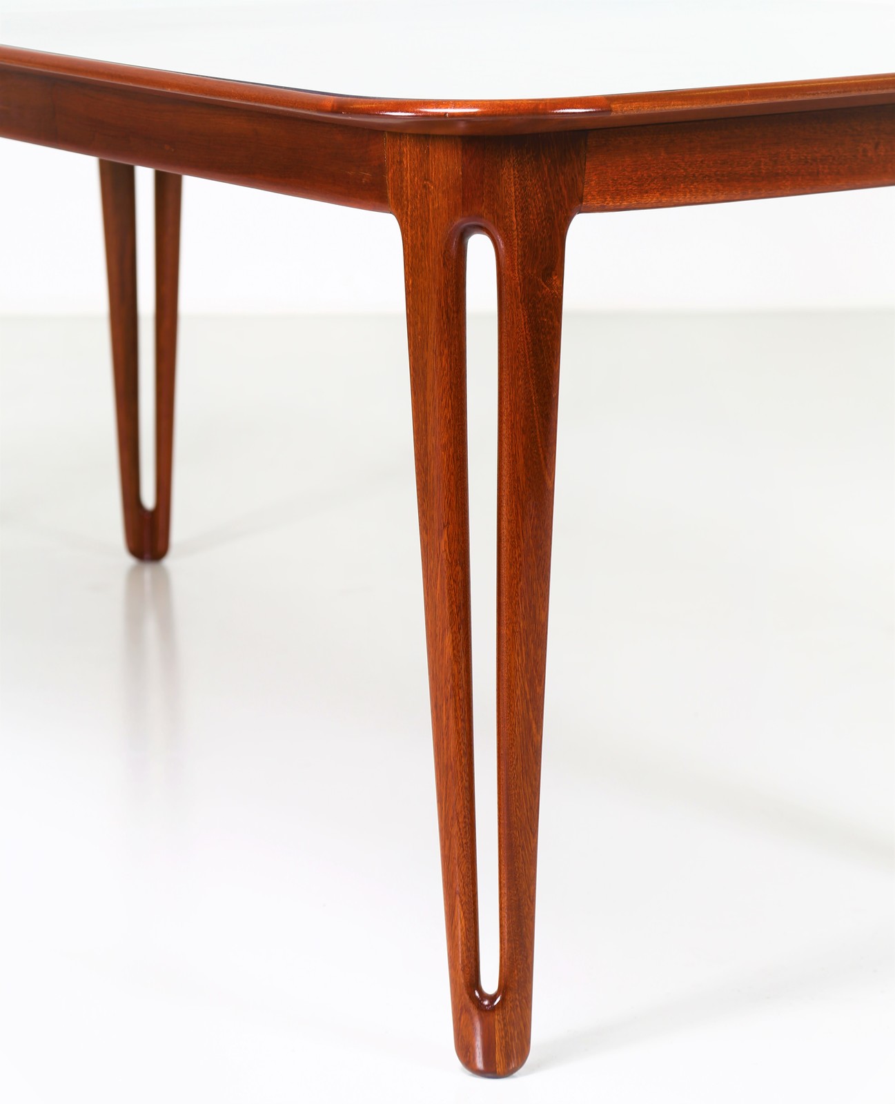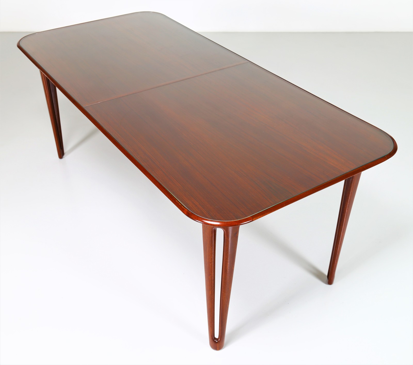 MANIFATTURA ITALIANA Tavolo in mogano con piano in cristallo anni 50. . Cm 196,00 x 79,00 x 93,00.