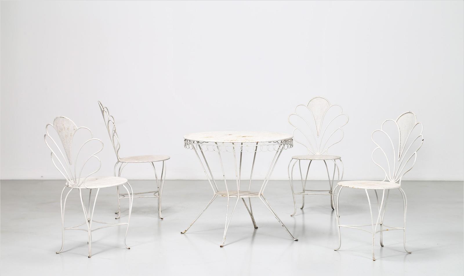 CASA E GIARDINO Set da giardino, tavolo e quattro sedie in metallo verniciato, anni 40. -. Cm 76,00 x 71,00 x 66,50.