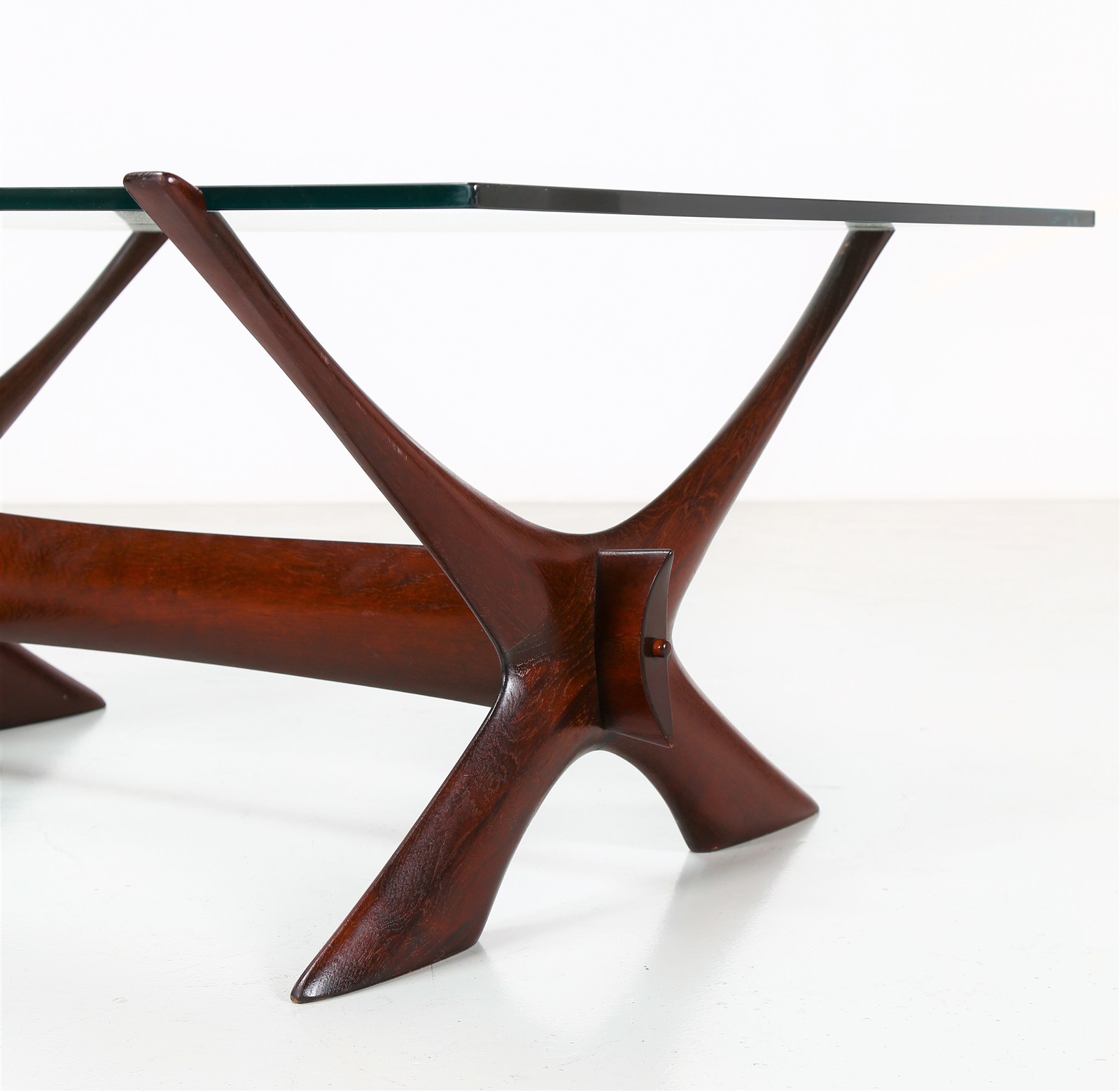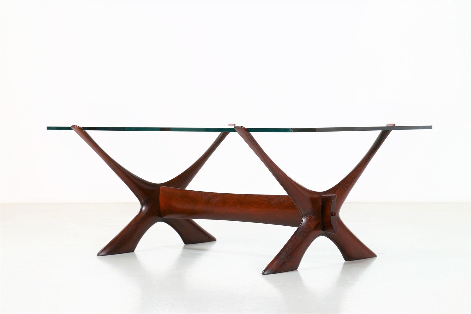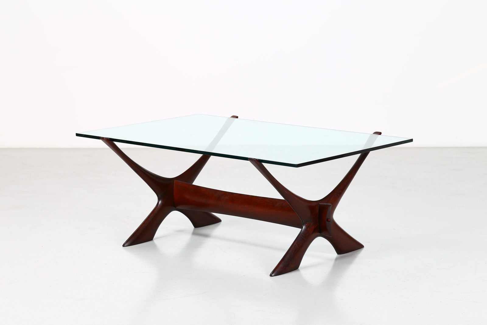 SCHRIEVER-ABELN FREDRIK Low wood table and glass top, for Örebro Glas, 1960. . Cm 132,50 x 54,00 x 94,50.