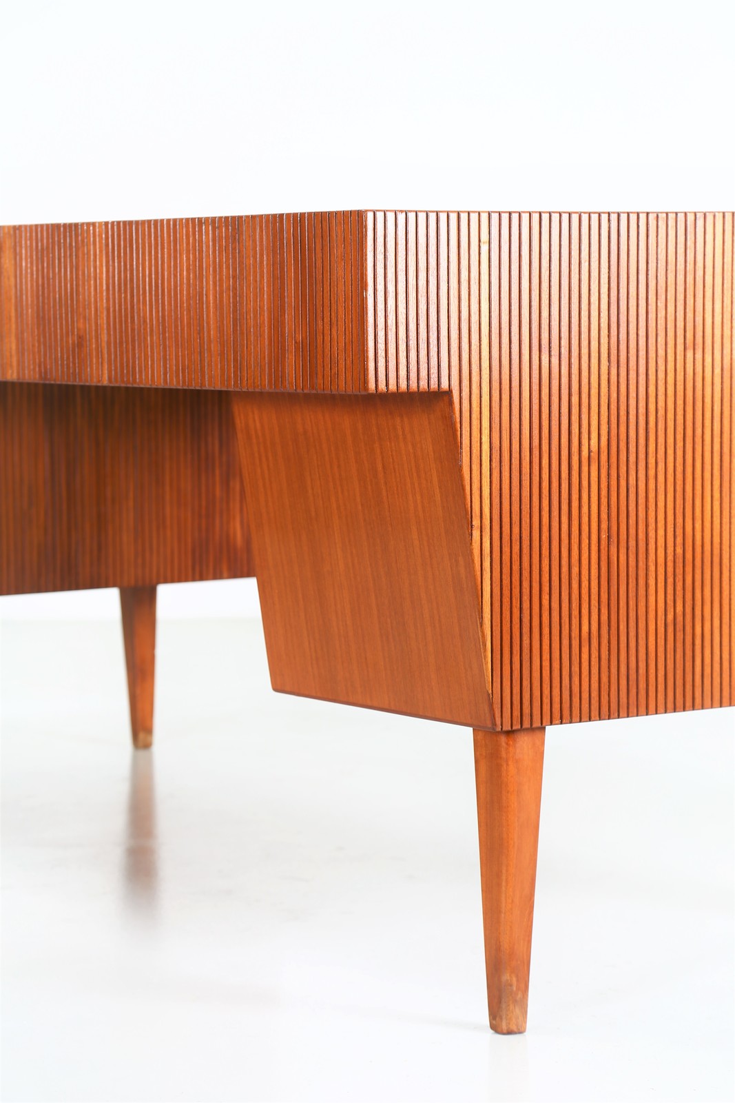 PONTI GIO' (1891 - 1979) Scrivania, dattilo e sedia in legno grissinato, per uffici Banca Nazionale del Lavoro anni 50. Expertice a cura di Salvatore Licitra Archives Gio Ponti Milano. -. Cm 190,00 x 80,00 x 90,00. Misura dattilo: H 50 L 50 P 35