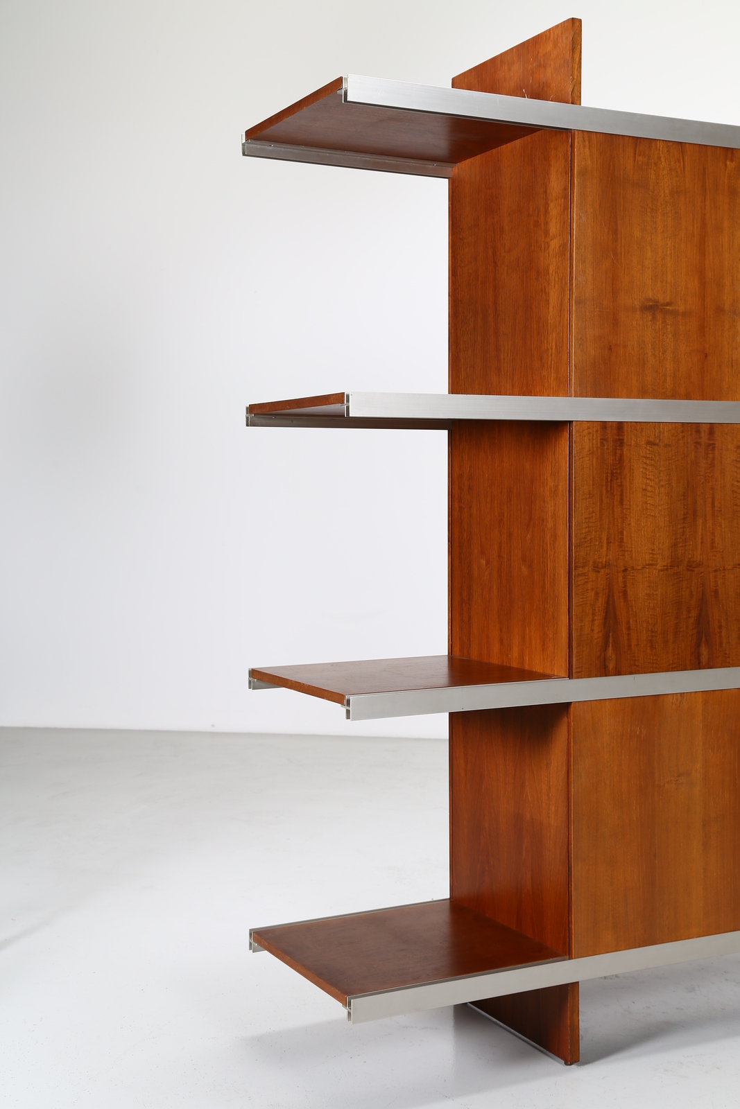 MANGIAROTTI ANGELO (n. 1921) Libreria in noce e alluminio, mod Multiuso per Poltronova 1965. -. Cm 195,00 x 197,00 x 46,50.