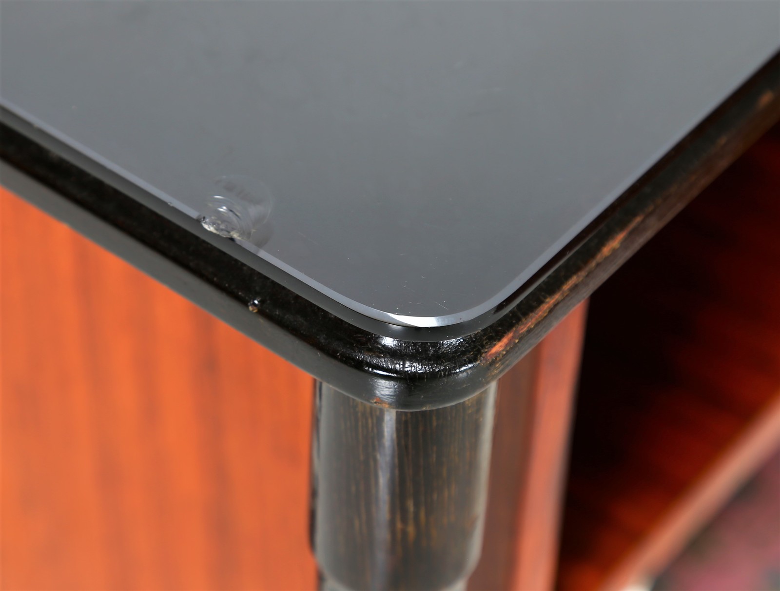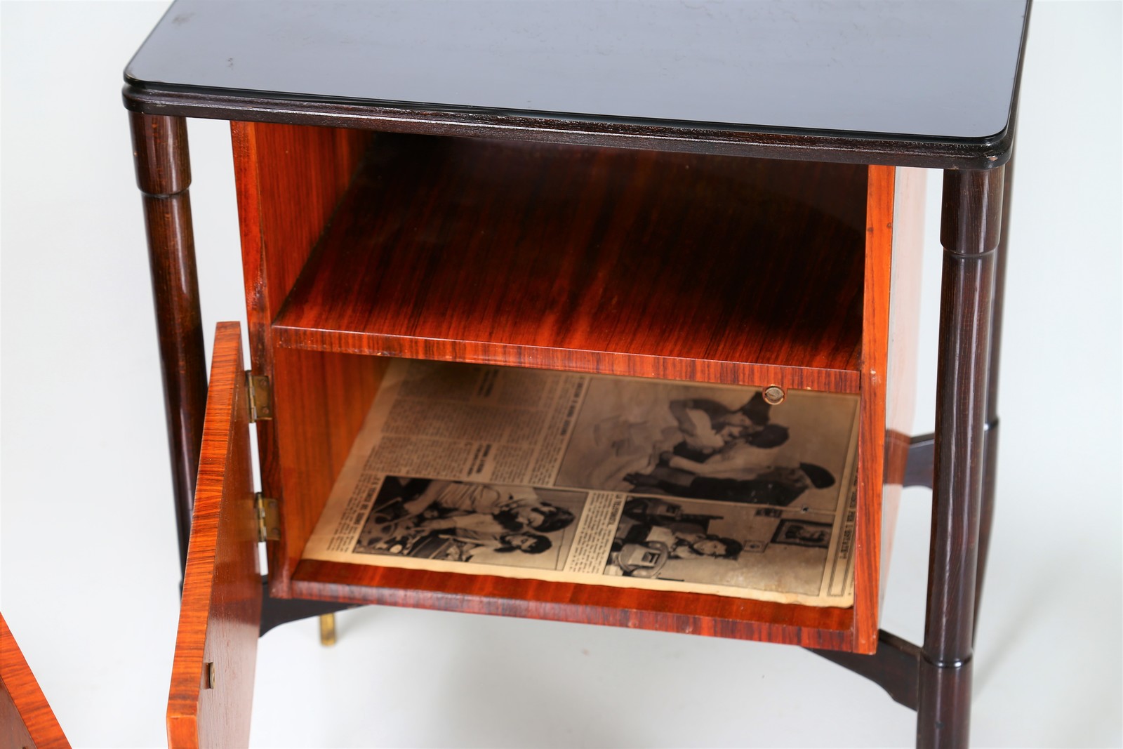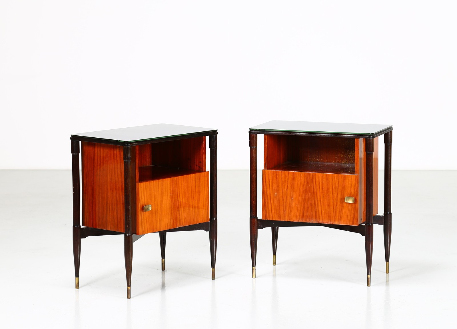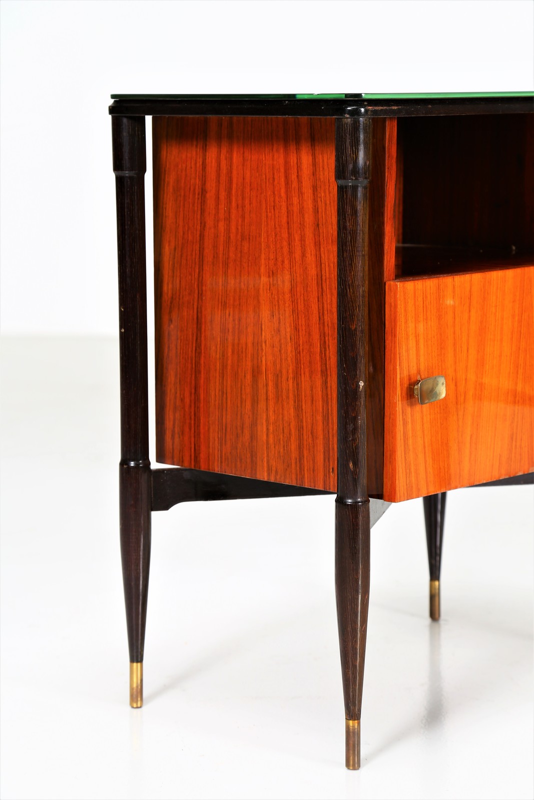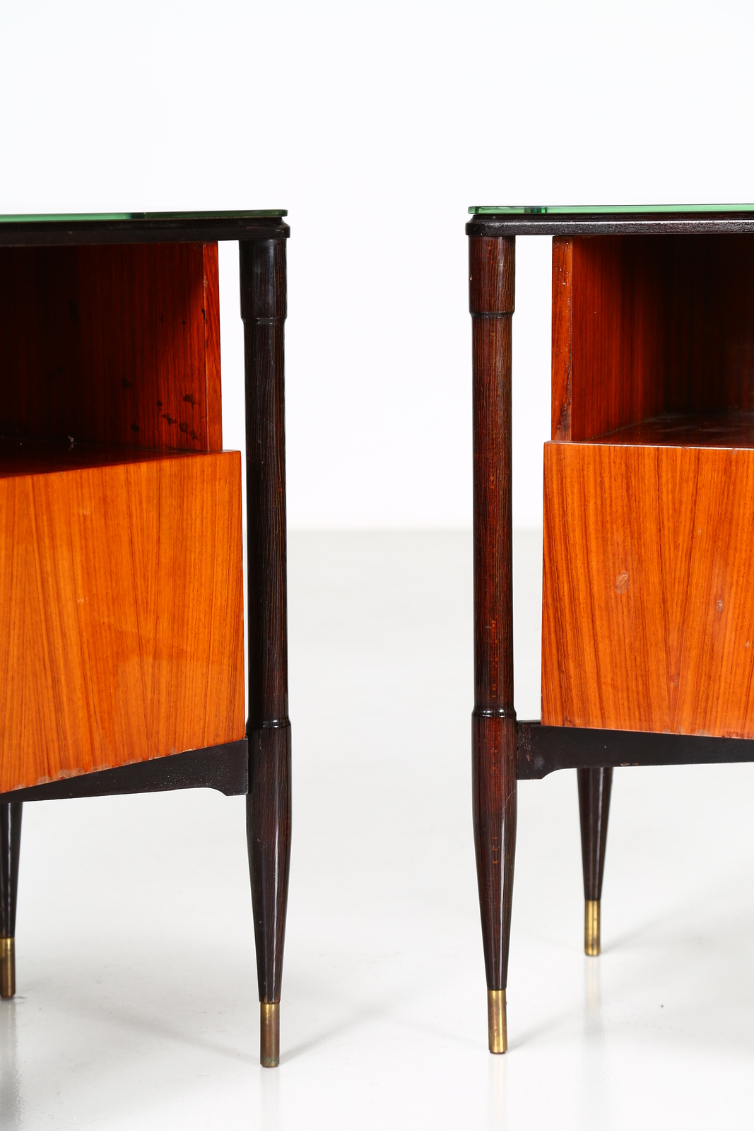 ITALIAN MANUFACTURE Pair of rosewood, ebonised wood and brass bedside tables, 1950s. . Cm 52,50 x 62,50 x 33,00. Condition: Good (one glass chipped)