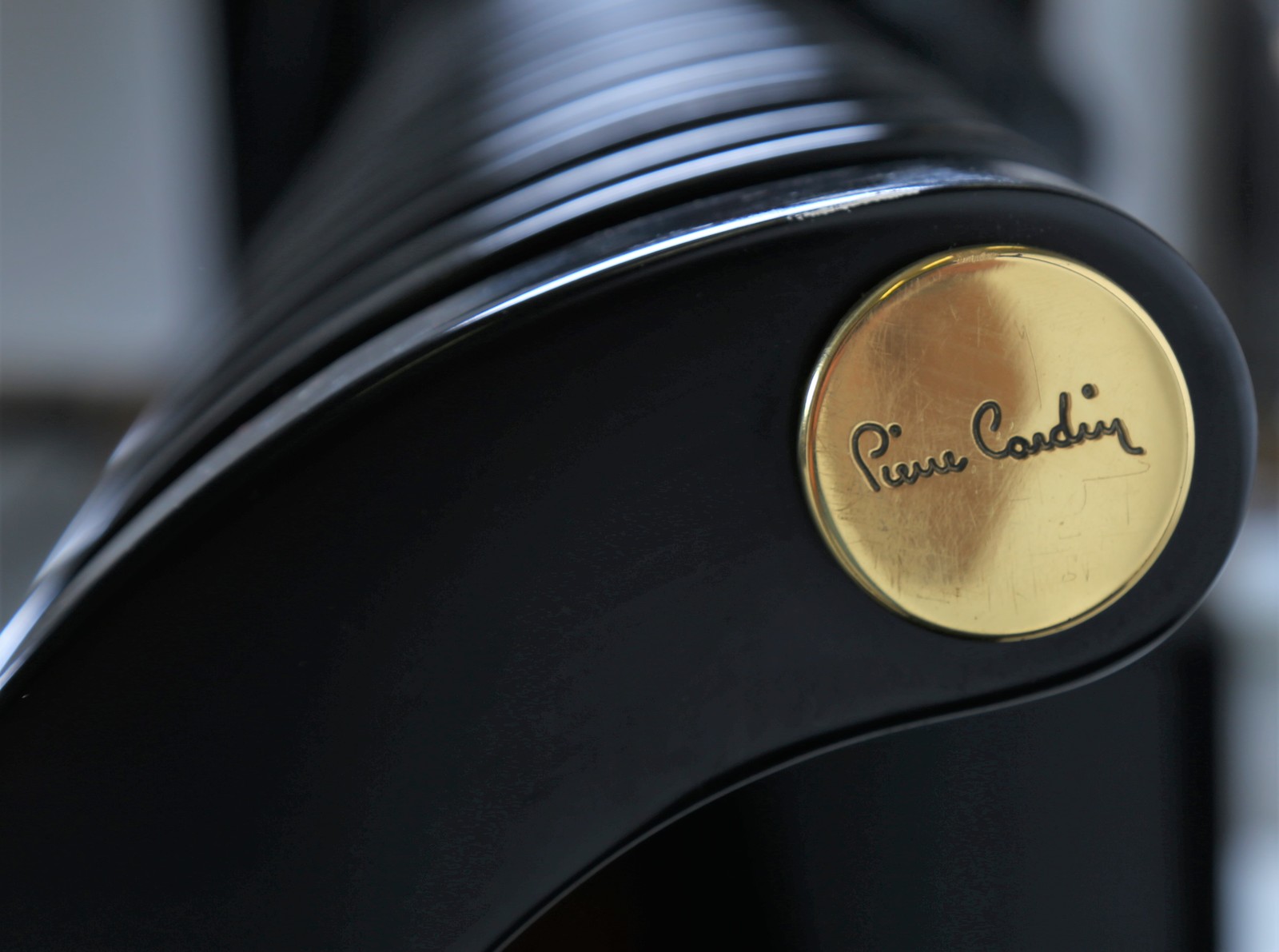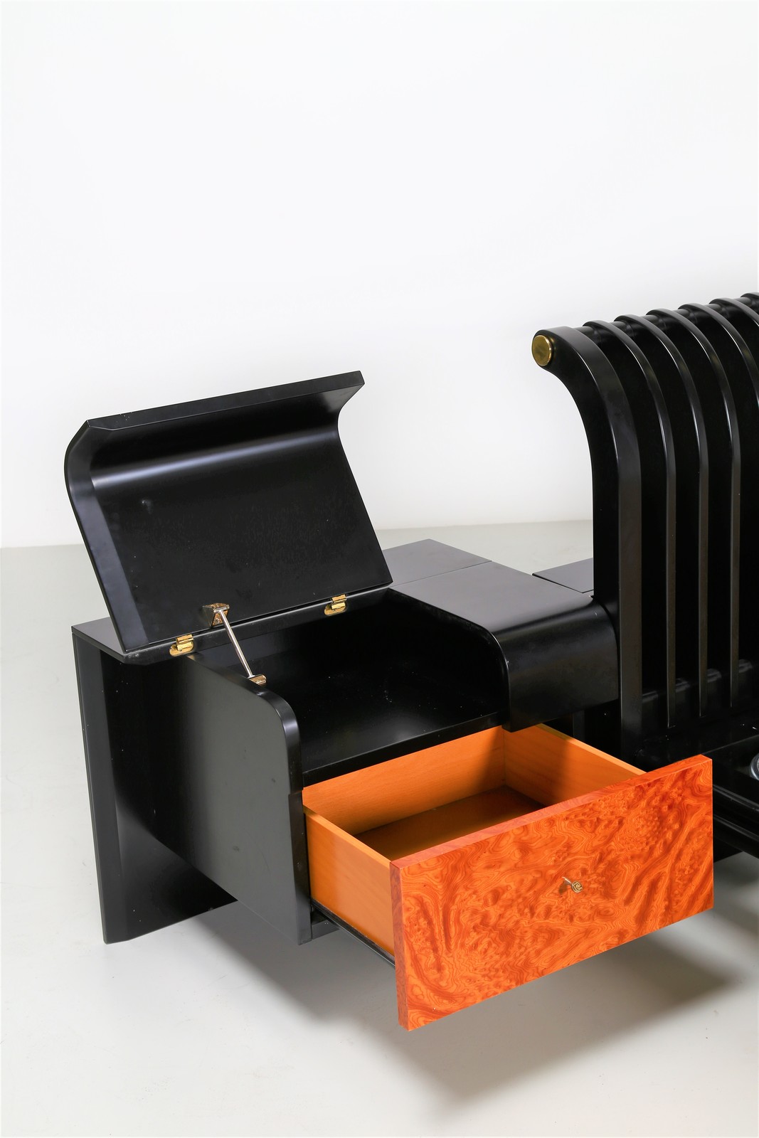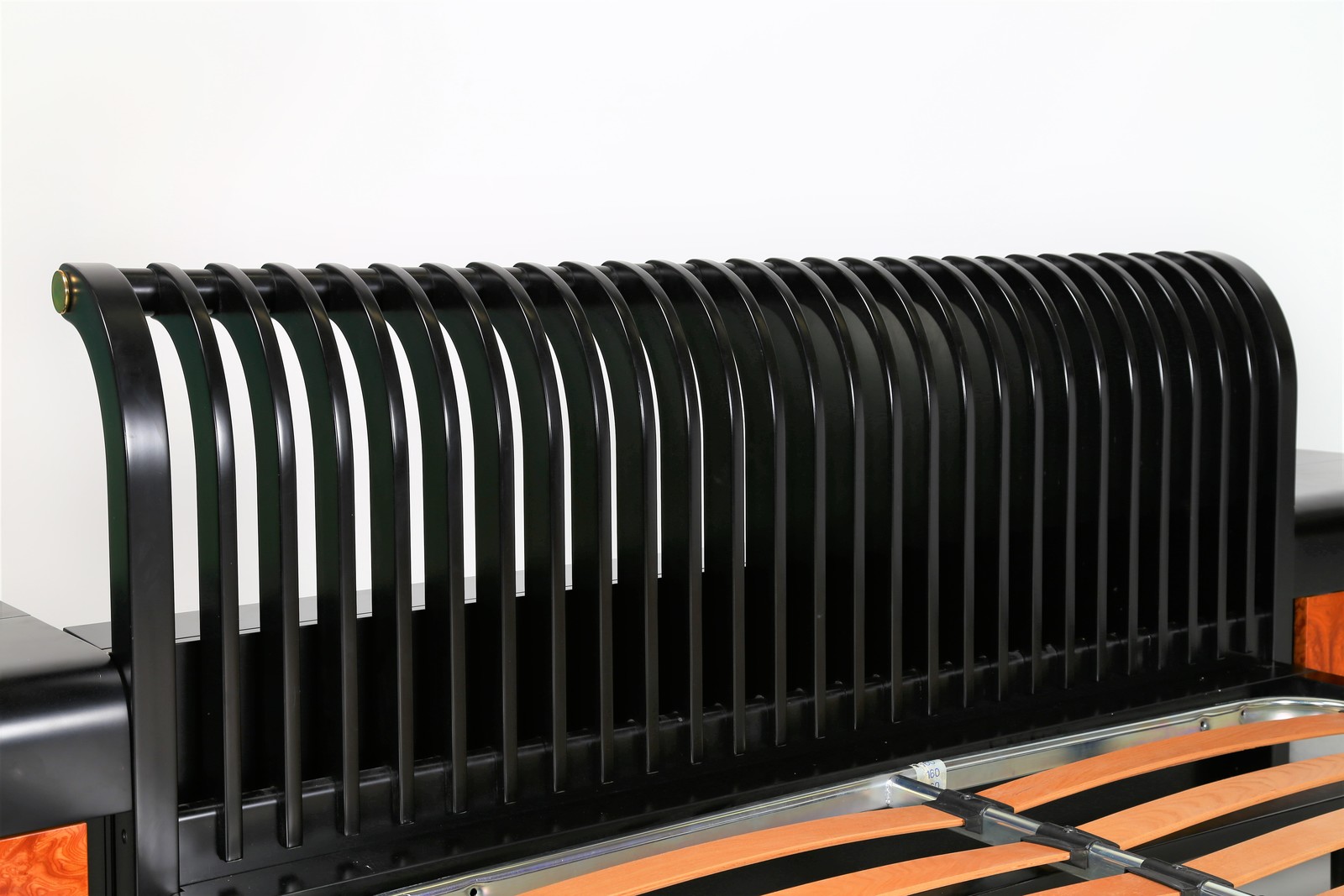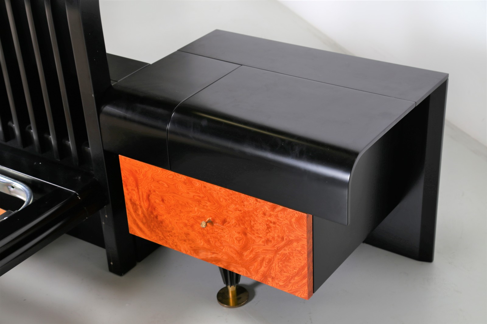 CARDIN PIERRE (n. 1922) Letto con comodini in legno, radica, pelle e dettagli...