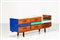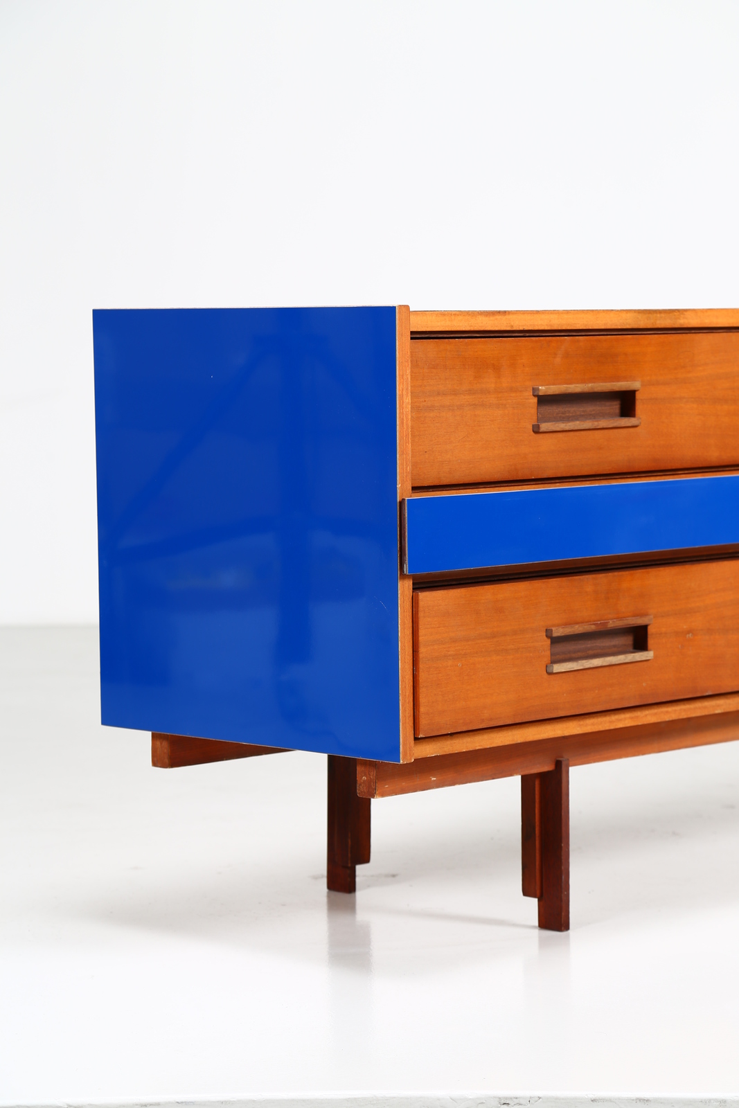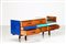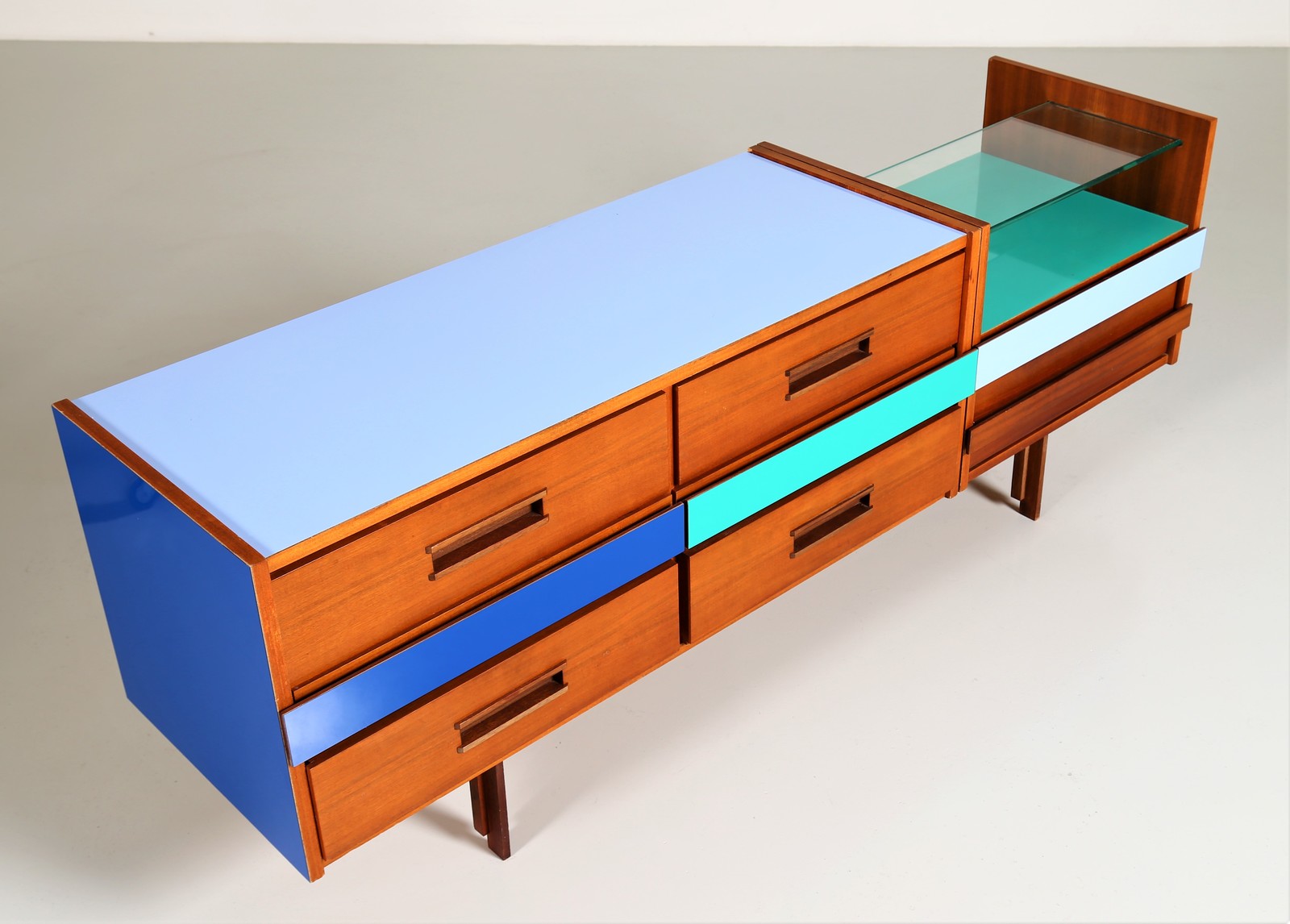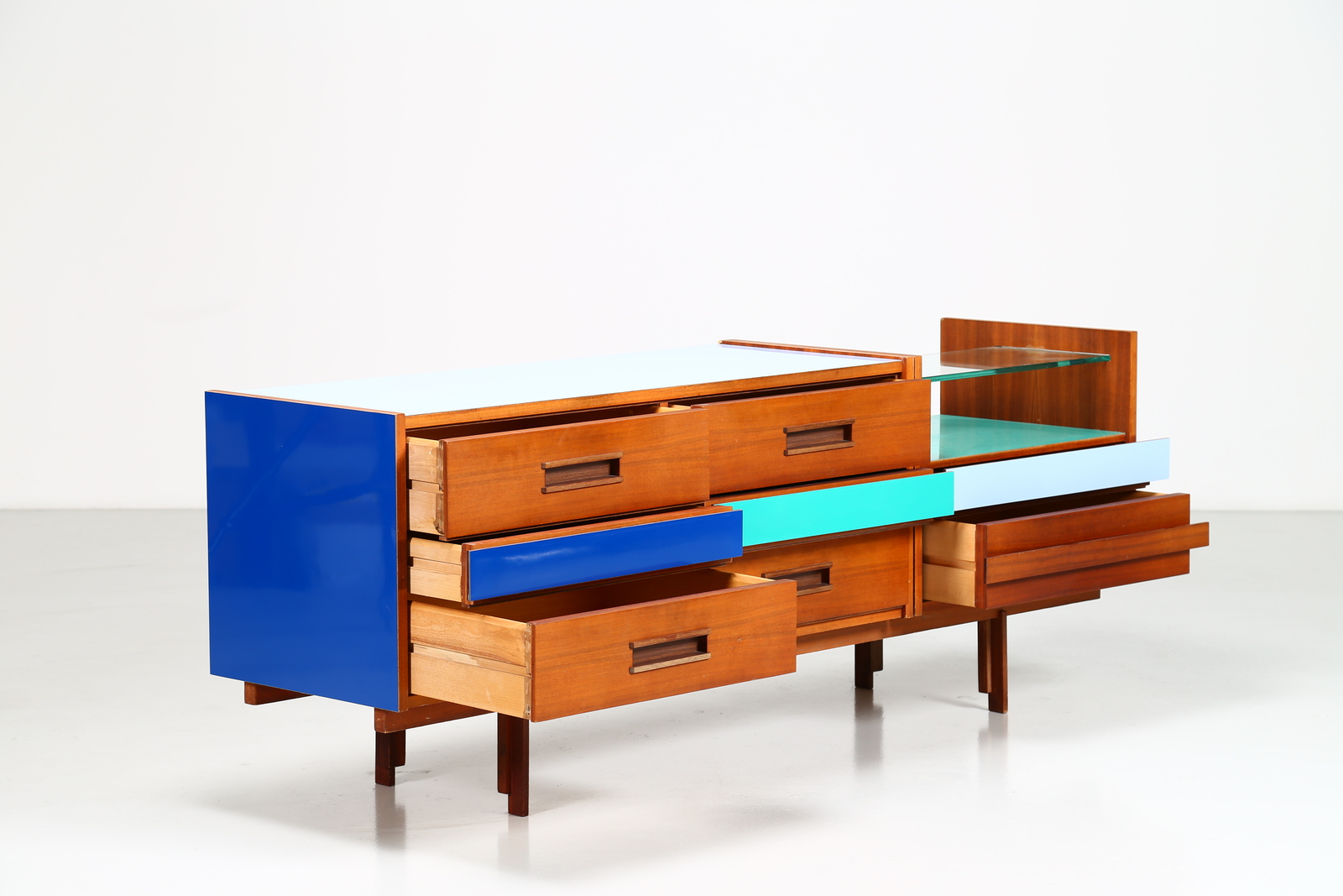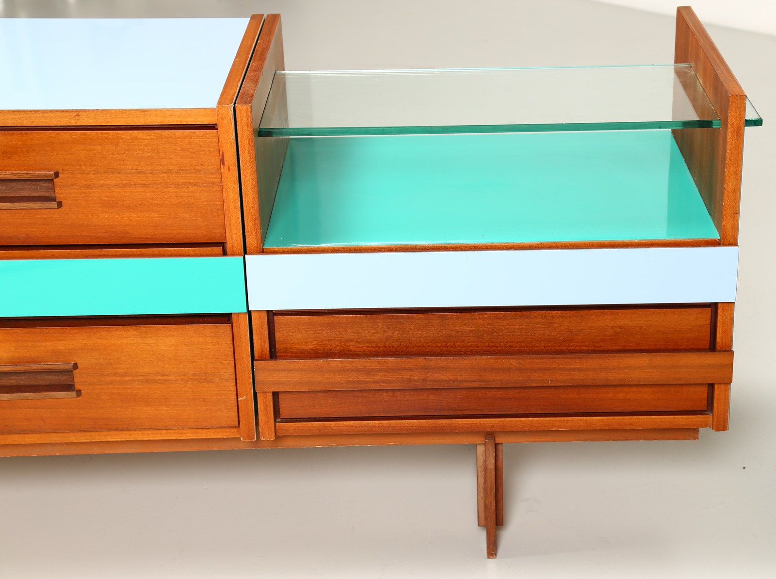ITALIAN MANUFACTURE Wood and formica chest of drawers and glass tops, 1960s. . Cm 195,00 x 73,50 x 50,00.