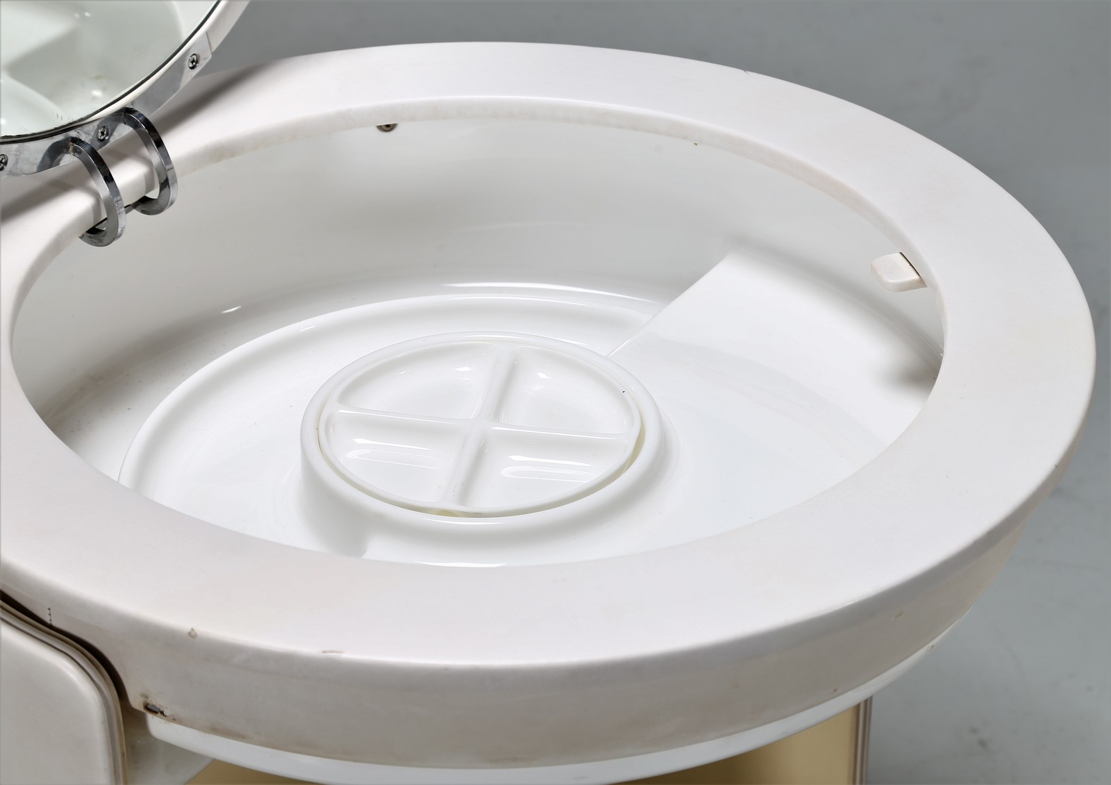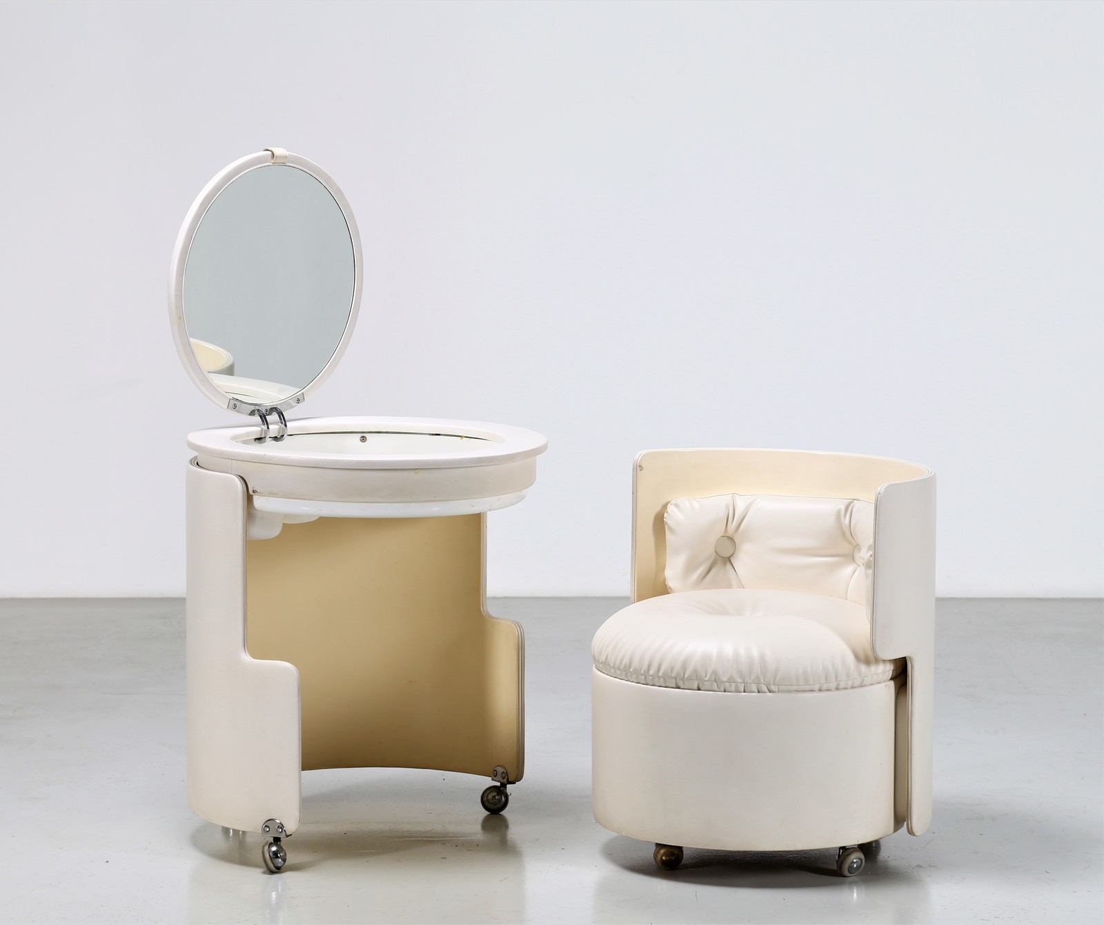 MASSONI LUIGI Toeletta con comodino e poltroncina in plastica, pelle e vetro, mod Dilly Dally per Frau 1968