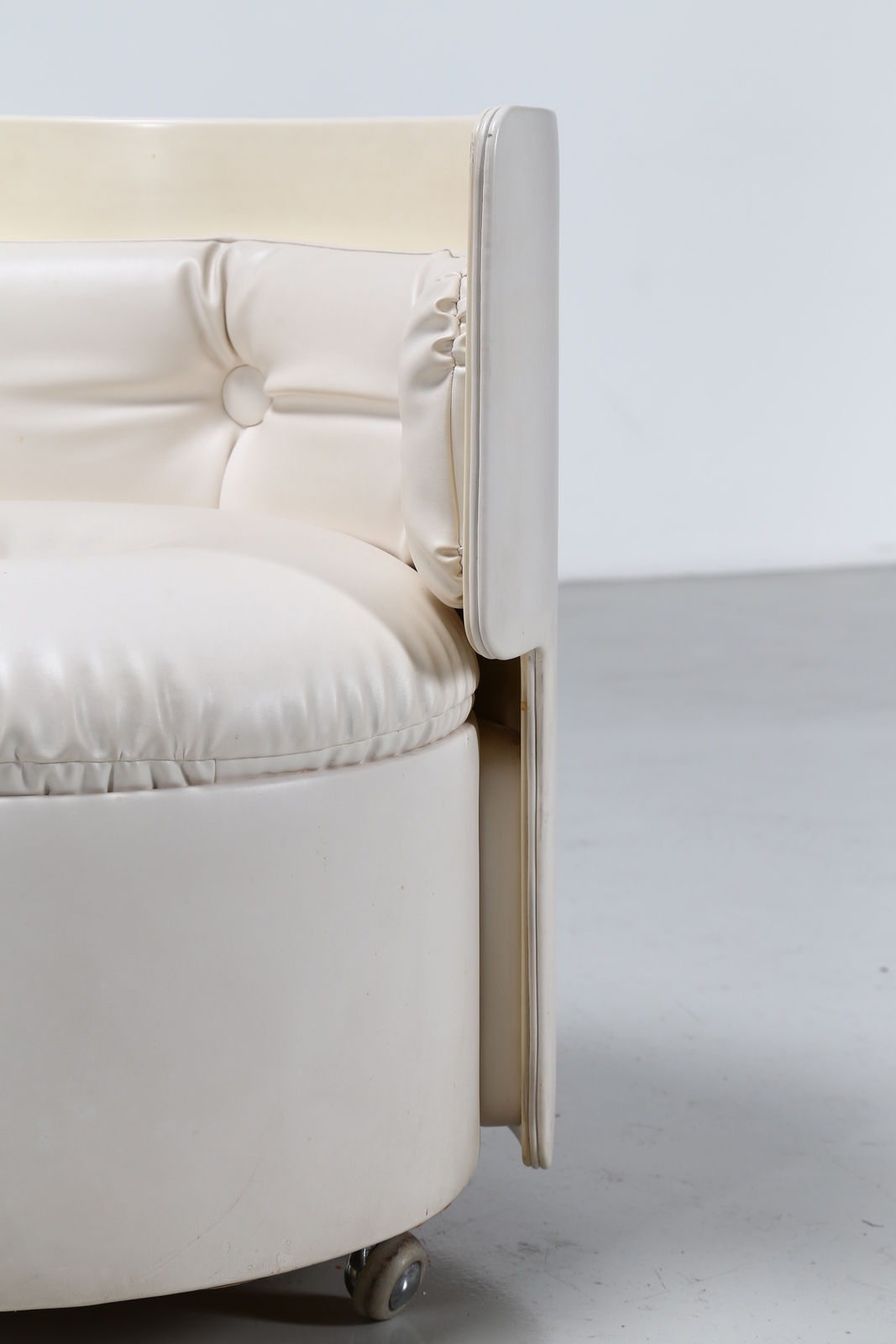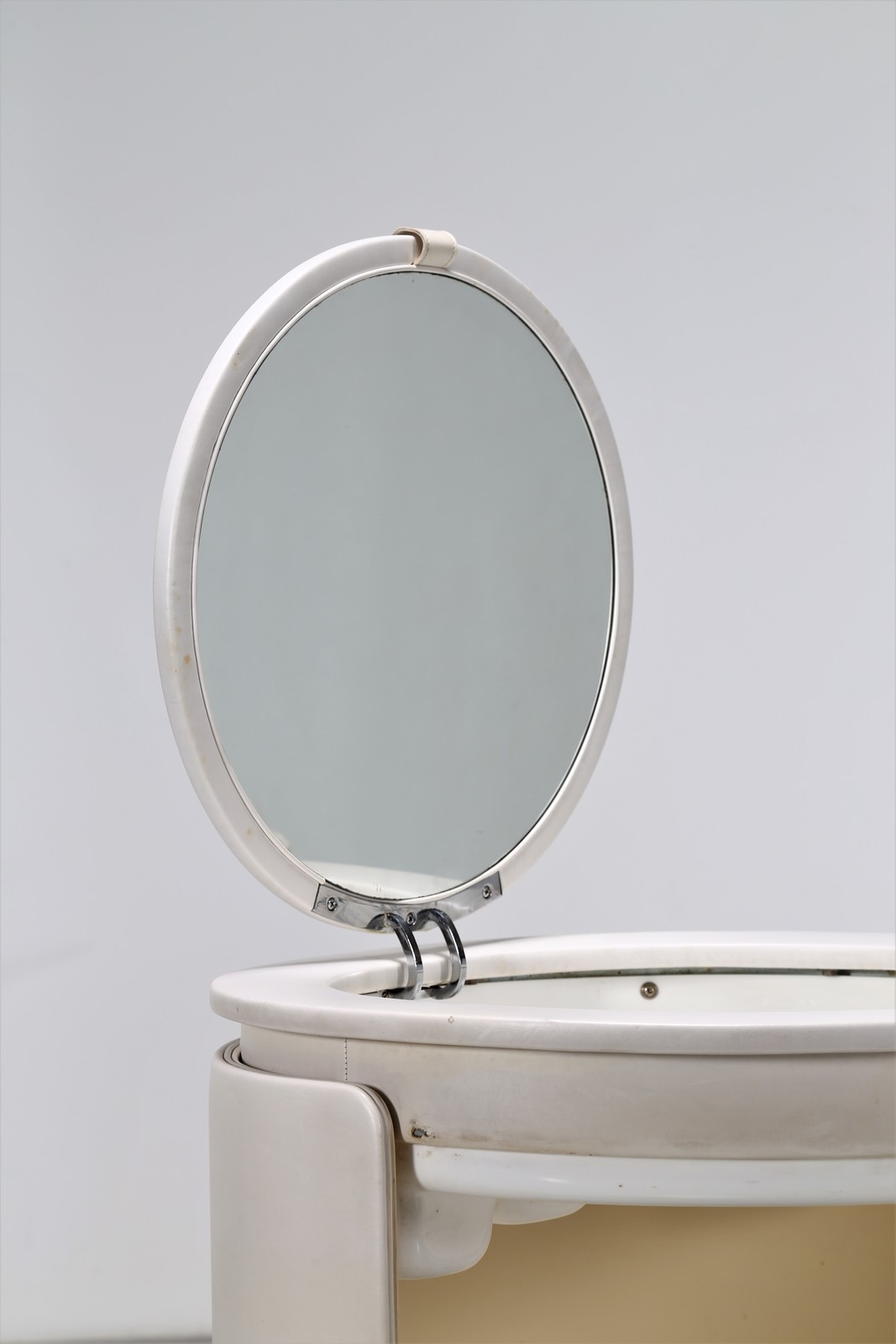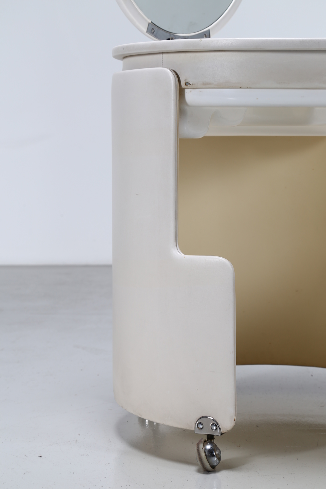 MASSONI LUIGI Plastic, leather and glass dressing table with bedside table and easy chair, mod. Dilly Dally for Frau, 1968