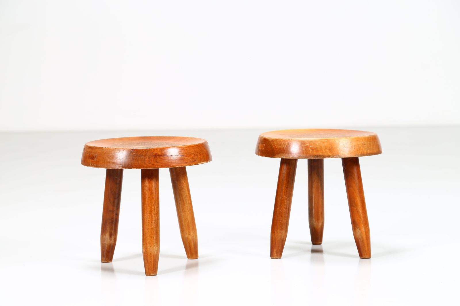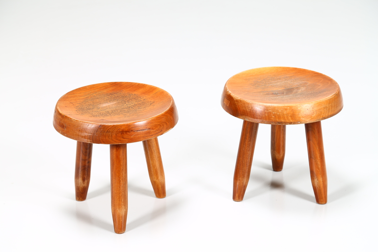 PERRIAND CHARLOTTE Attrib. Pair of walnut stools, 1950s. . Cm 30,50 x 30,00 x 30,50.