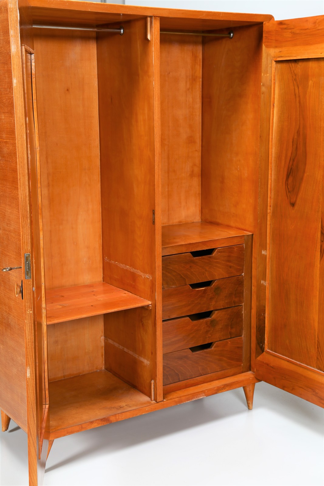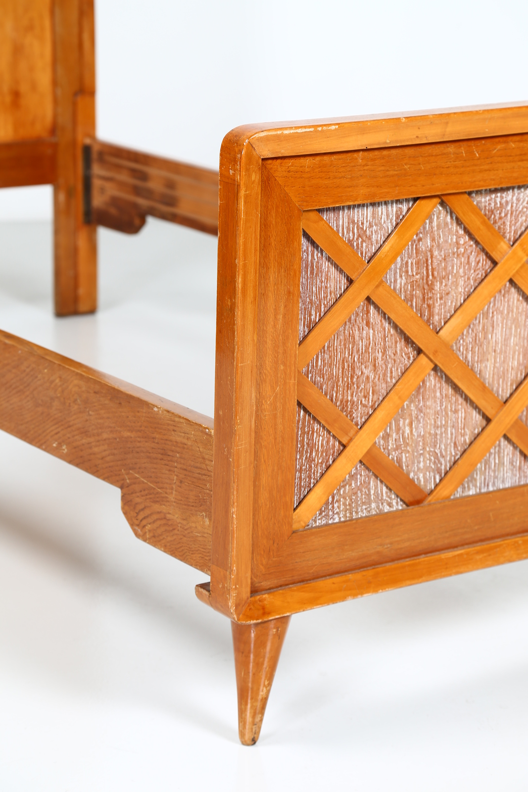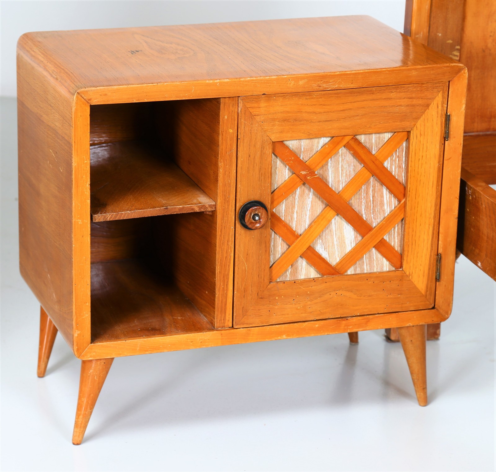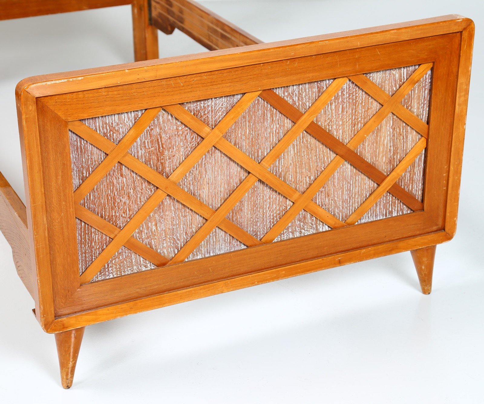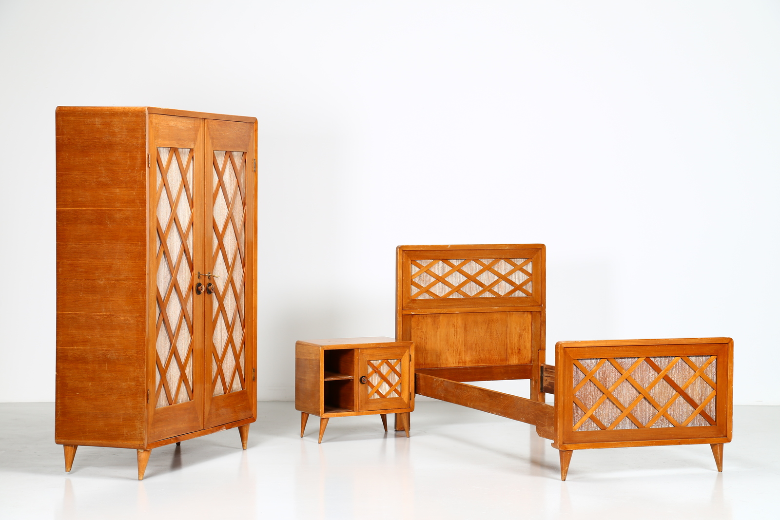 PONTI GIO' (1891 - 1979) Bedroom for young lady, wardrobe, single bed and bedside table, 1940s Expertise available curated by Salvatore Licitra Archives Gio Ponti Milan. . . Sizes: Bed H 110 L 100 D 200 Wardrobe H 183 L 120 D 52 Bedside table H 56 L 60 D 35