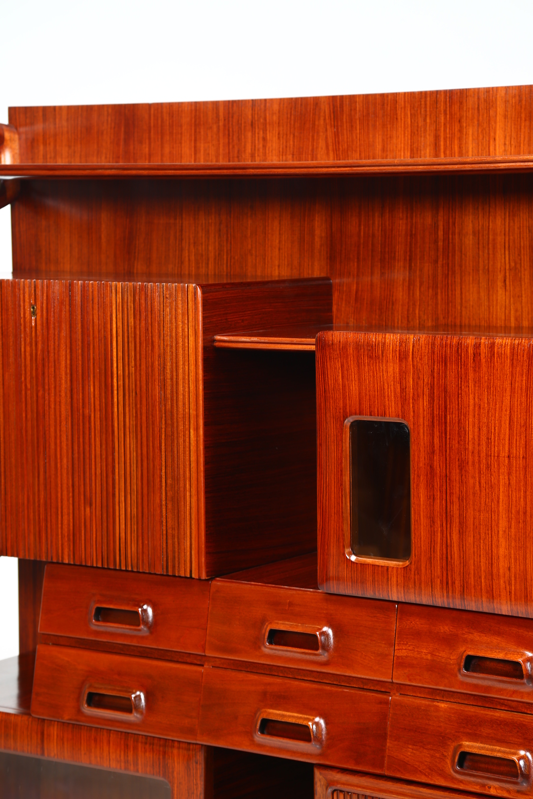 CAVATORTA SILVIO Rosewood and mahogany mirrored cabinet with glass tops, 1950s. . Cm 230,00 x 167,00 x 62,00.