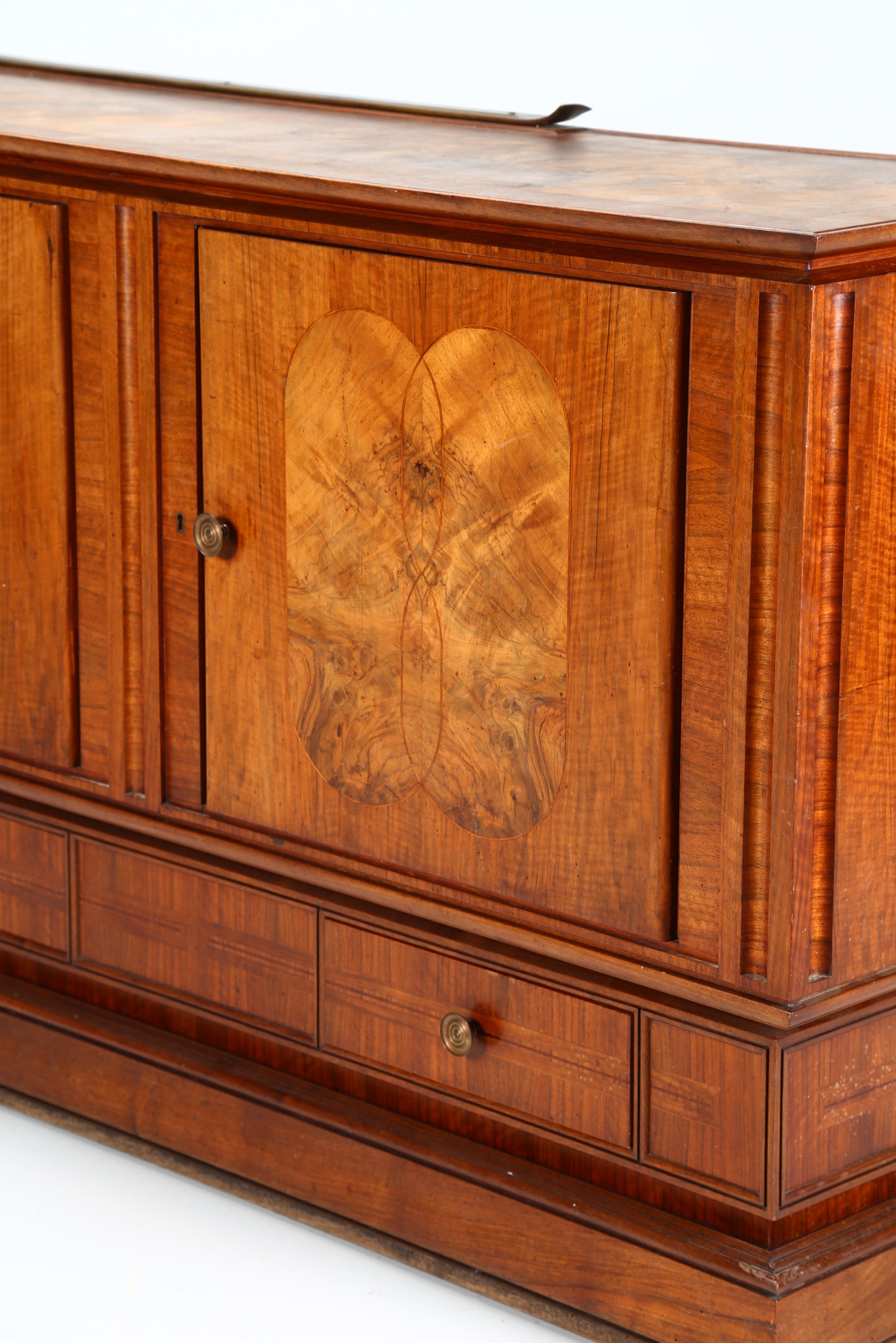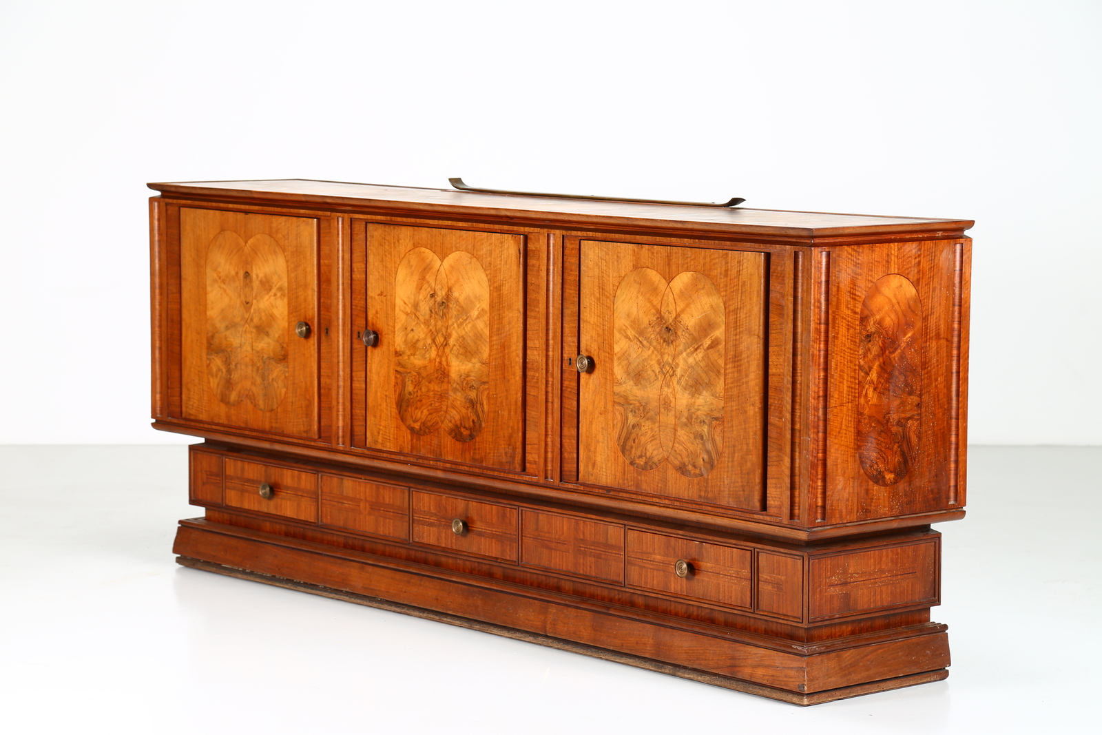 COPPEDÈ GINO Attrib. Credenza in legno e radica di noce, dettagli in ottone, anni 30. -. Cm 242,00 x 105,00 x 50,50.