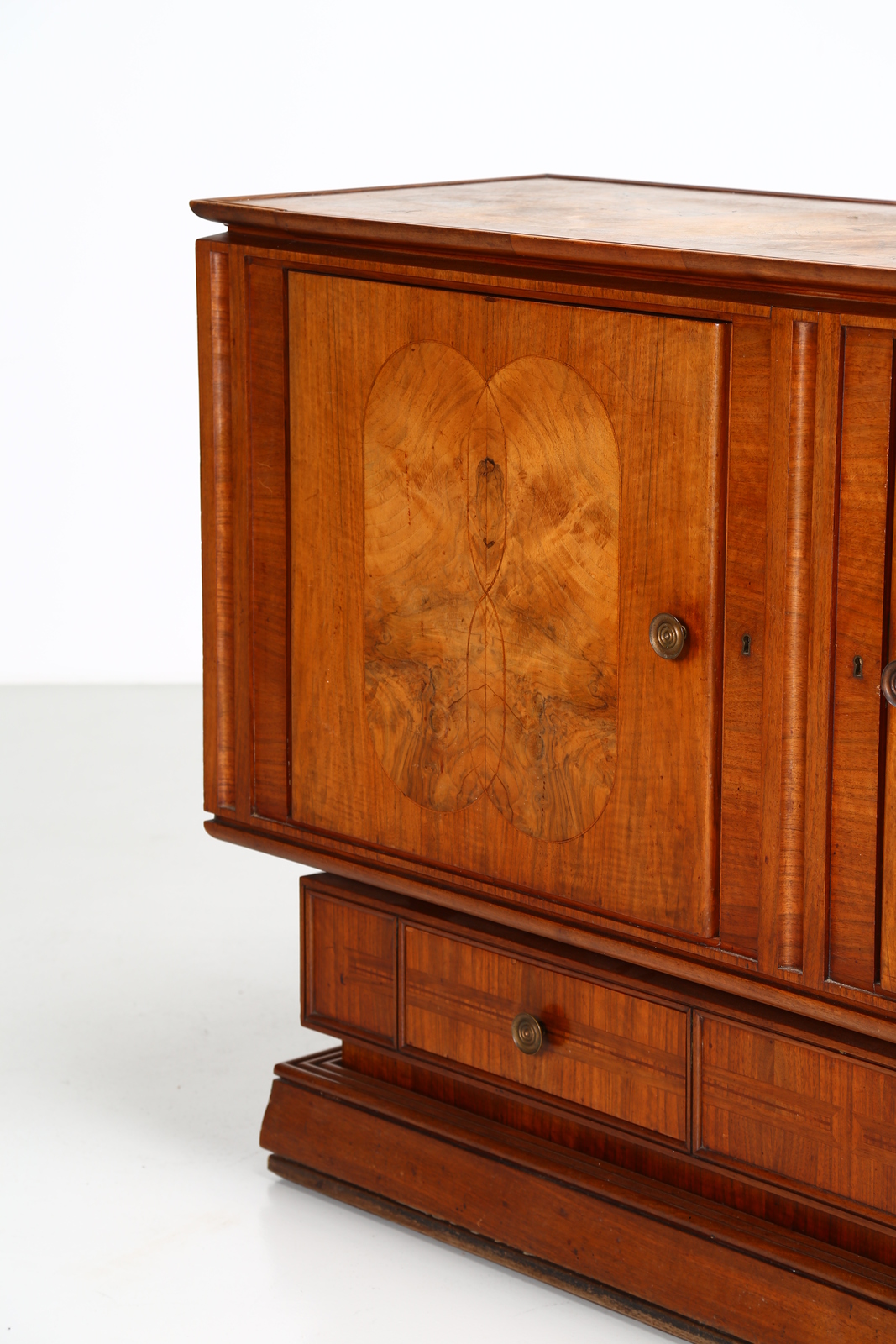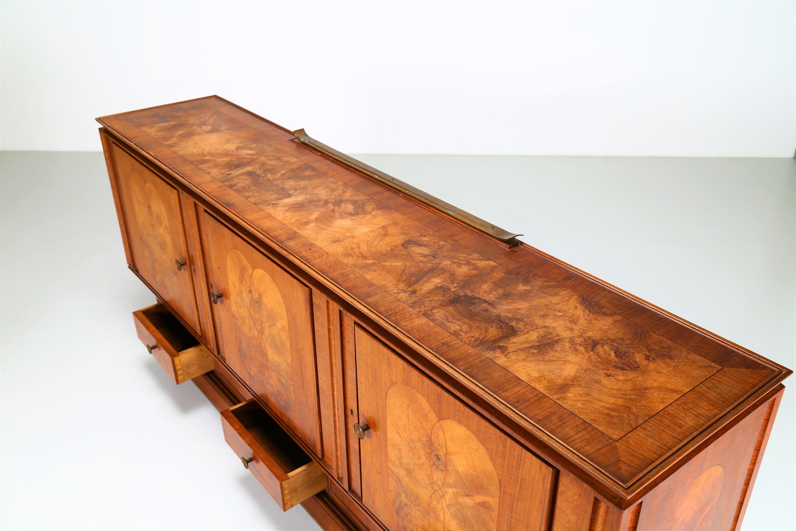 COPPEDÈ GINO Attrib. Wood and walnut briar sideboard, brass details, 1930s. . Cm 242,00 x 105,00 x 50,50.