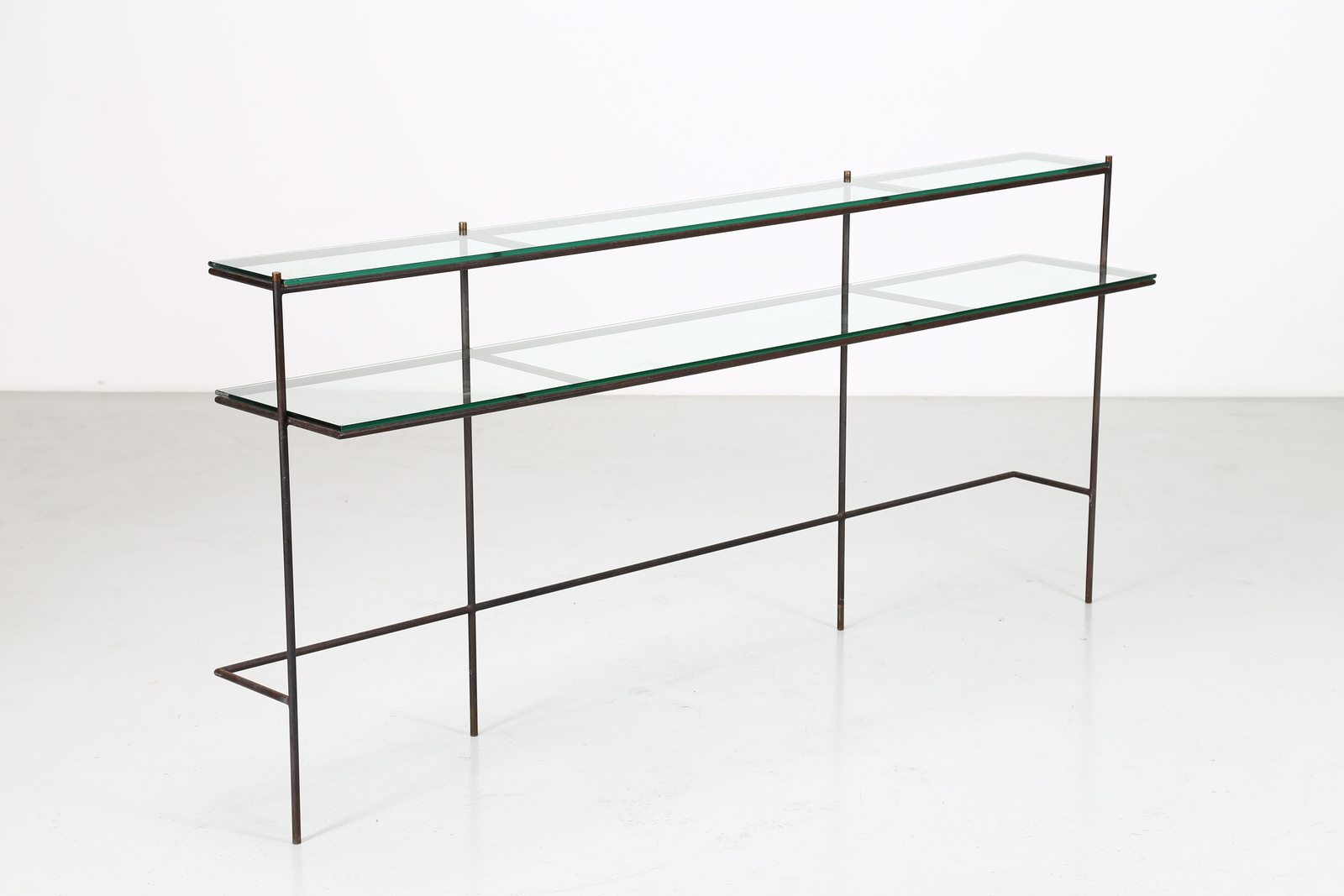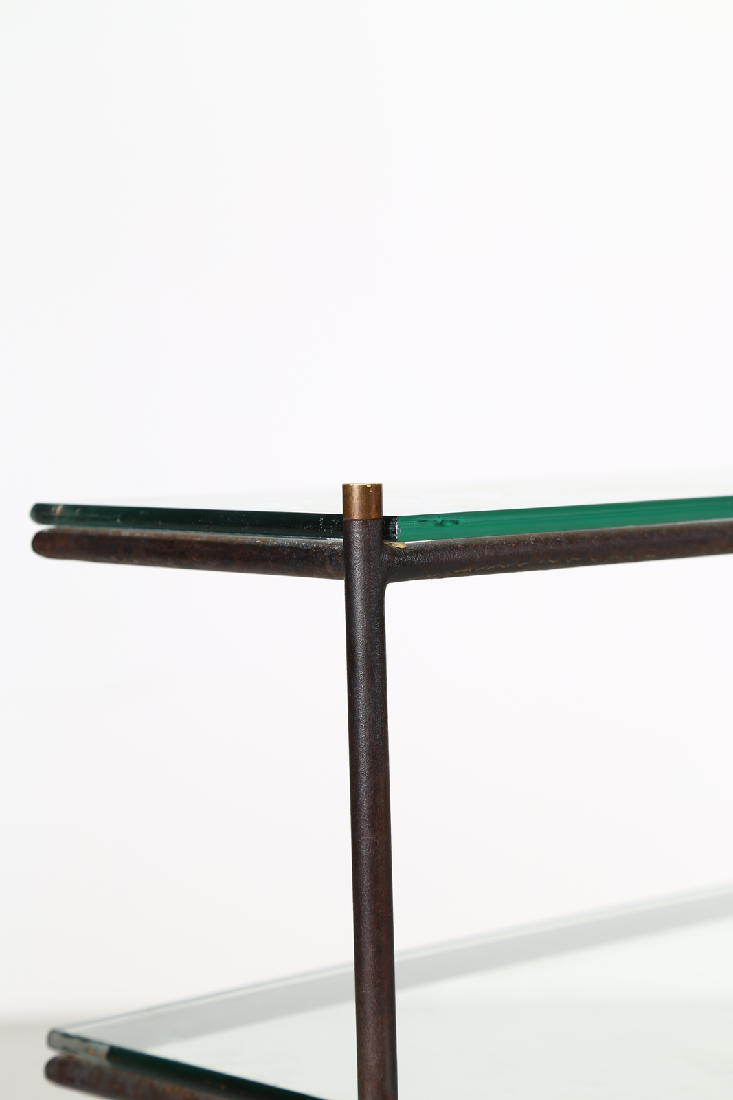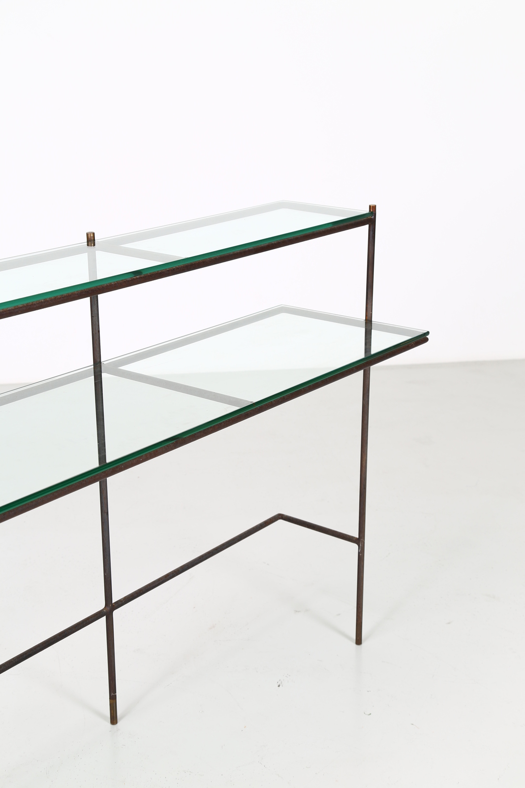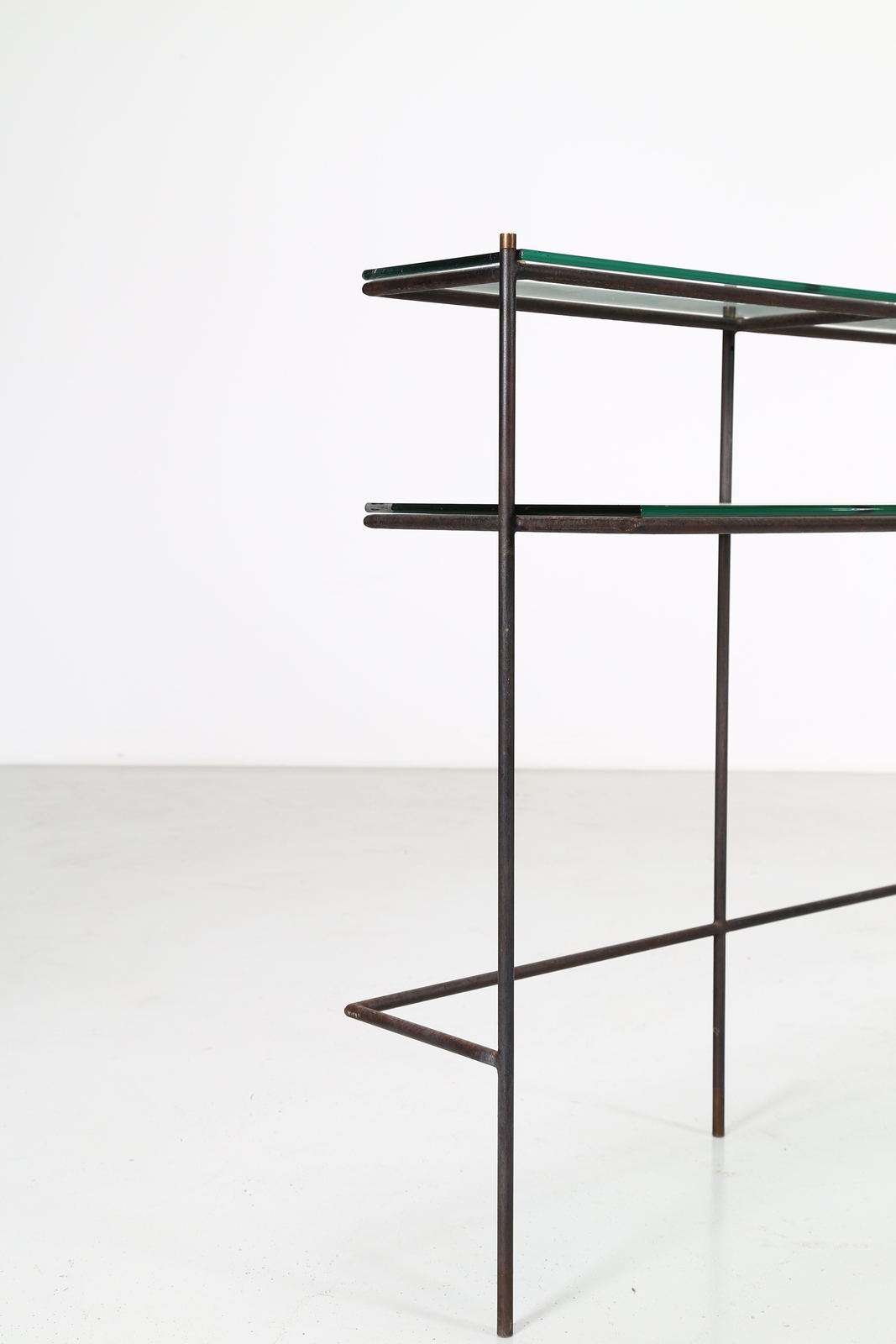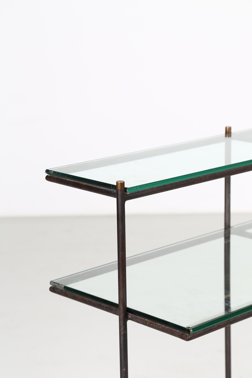 ANONIMO Consolle in tondino di ferro dettagli in ottone e piani in cristallo....