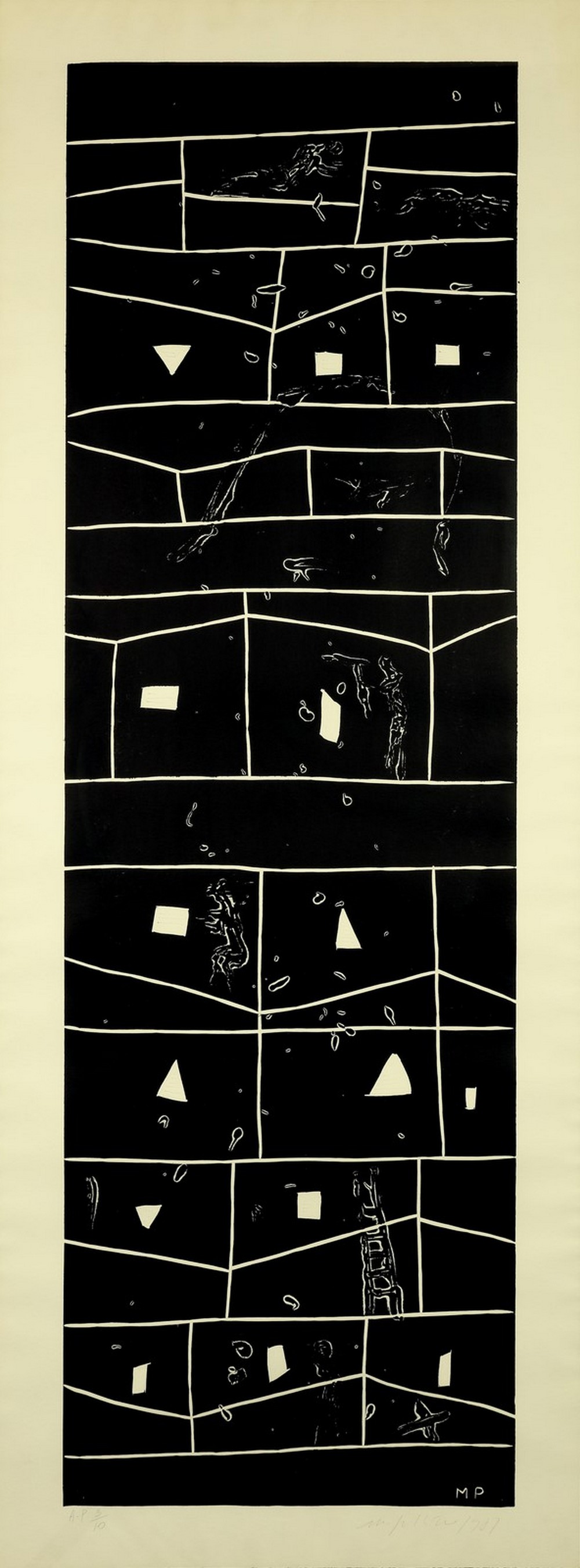 PALADINO MIMMO (n. 1948) Suite Atlantico II - Rectangular Grid with Figures. 1987. Linoleografia. Cm 75,00 x 204,50. A.P.3/10. Tiratura, firma e anno a matita in basso. Firma monogrammata in lastra in basso a destra. Editore Waddington Graphics, London; Stampatore Giorgio Upiglio - Grafica Uno, Milano. Pubblicazioni: Mimmo Paladino Opera Grafica a cura di Enzo Di Martino, Ed. Art of this Century, n. 105 a pag. 123. Dimensione lastra: 188.5x58.5 cm.