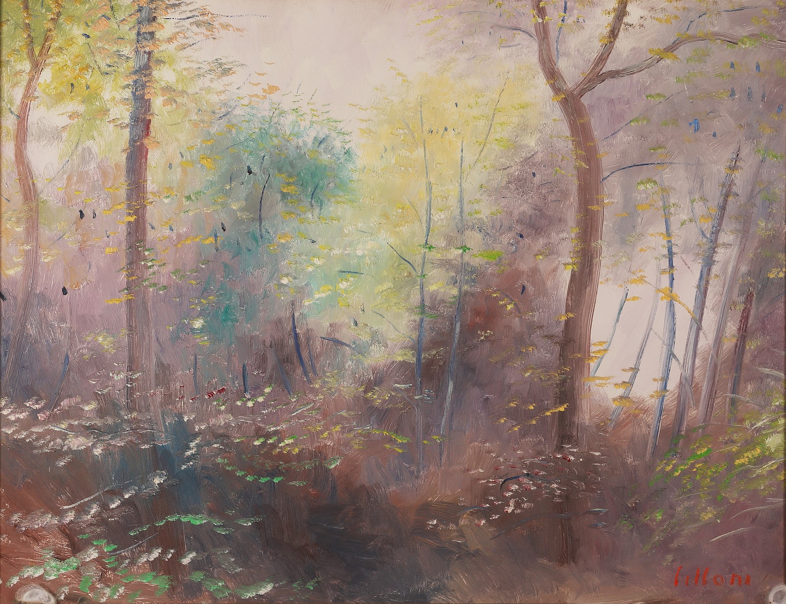 LILLONI UMBERTO (1898 - 1980) Autumn on the Generoso mountain. 1967. Oil on canvas . Cm 65,00 x 50,00. Signature lower right. At the back title, signature and year. Publication: Umberto Lilloni's catalog, Volume III, Skira editor, Milan, 2002, pag. 1003, i. 2227. Cornice presente