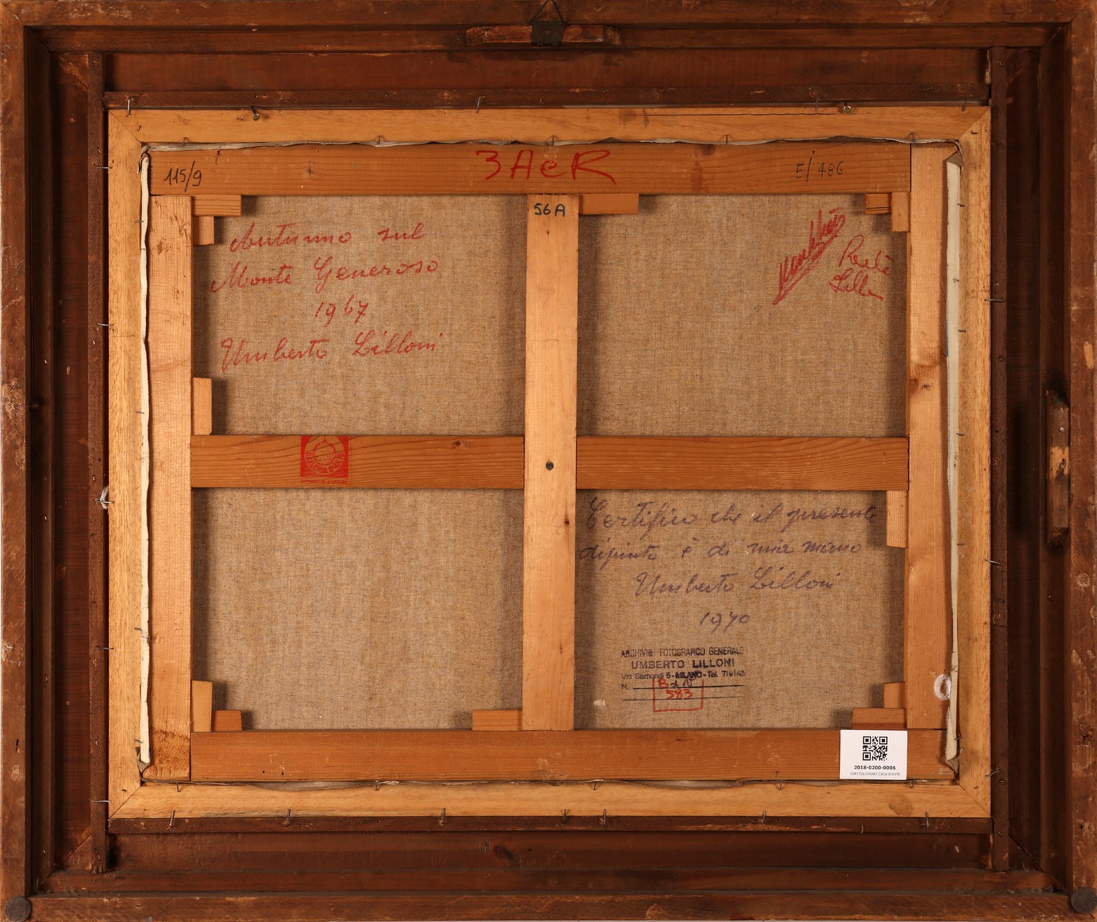 LILLONI UMBERTO (1898 - 1980) Autunno sul Monte Generoso. 1967. Olio su tela . Cm 65,00 x 50,00. Firma in basso a destra. Al retro titolo, firma e anno.Pubblicazione: Umberto Lilloni - Catalogo ragionato dei dipinti e dei disegni, Volume III, Skira Editore, Milano, 2002, pag. 1003, tav. 2227. Cornice presente