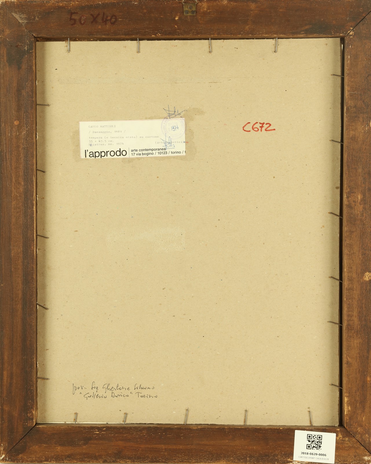 MATTIOLI CARLO (1911 - 1994) Paesaggio. 1981. Tecnica mista su cartone. Cm 35,00 x 43,00. Firma in basso a destra. Provenienza: Galleria Davico; Galleria d'arte L'Approdo, Torino (cartiglio al retro); Collezione privata, Torino. Cornice presente
