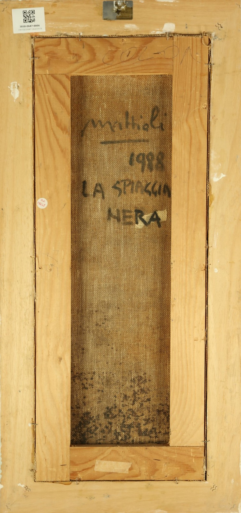 MATTIOLI CARLO (1911 - 1994) La spiaggia nera. 1988. Olio su tela . Cm 29,00 x 75,00. Al retro titolo, firma e anno. Autentica dell'artista su fotografia. Certificato di autenticità Telemarket, Roncadelle (Bs). Cornice presente