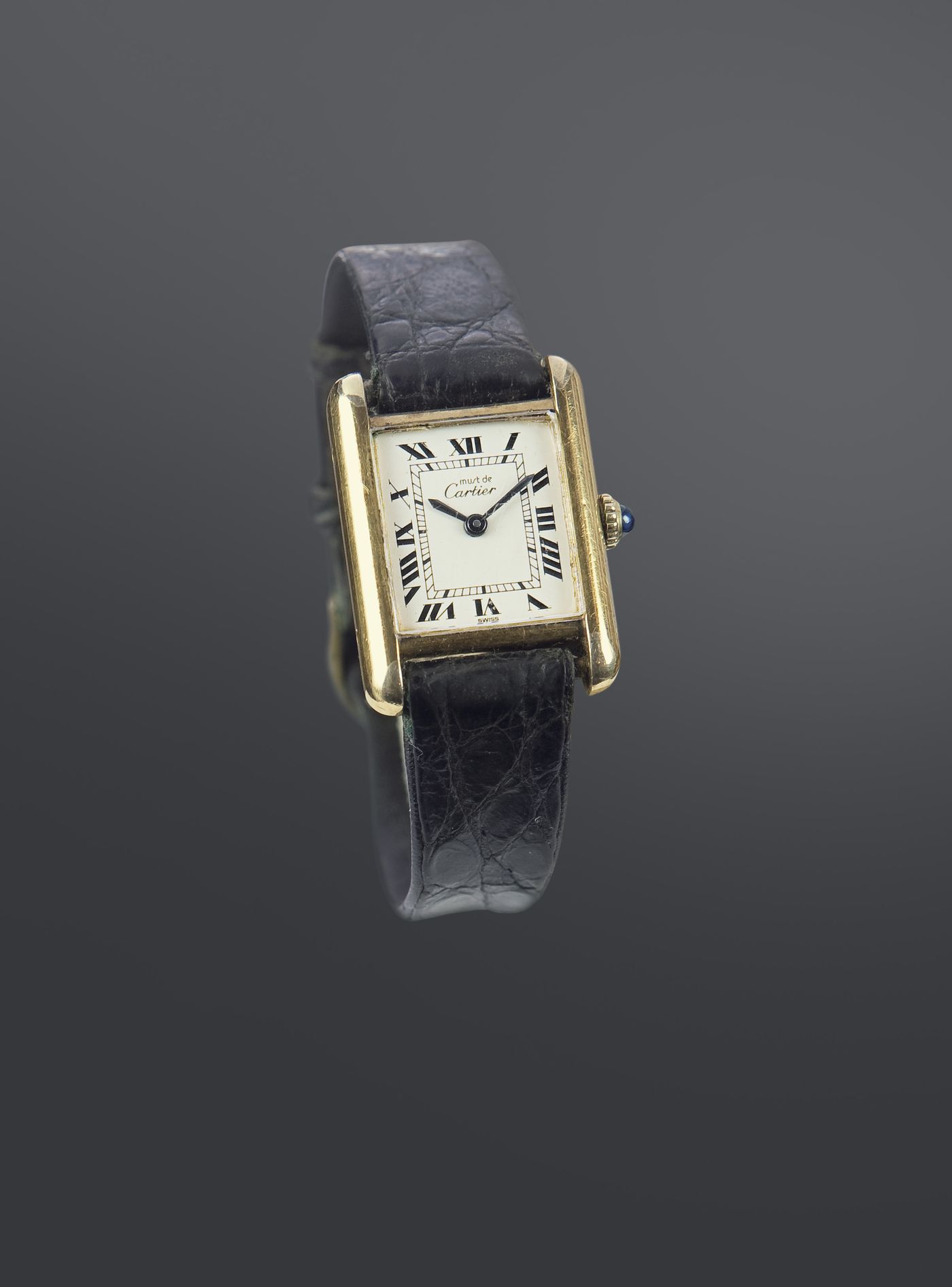 CARTIER Tank Vermeil, anni '70 29x22 Cassa di forma in argento, laminata in oro giallo quadrante soleil chiaro, indici a numeri romani con minuteria a binario Movimento a carica manuale Certificato della maison