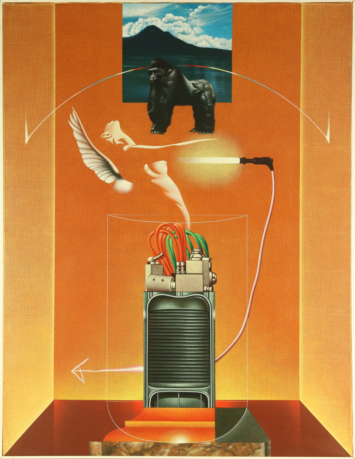 SARRI SERGIO (n. 1938) The angel and the beast. 1983. Acrylic on canvas. Cm 89,00 x 116,00. At the back title, signature and year. Artist's authenticity certificate on photo ( uncorrect sizes). Publication: Sergio Sarri catalog by Ugo Paganini and Cristiano Ragni, Overtime Art, Forlì, 2009, p. 236, i. 621 Cornice presente