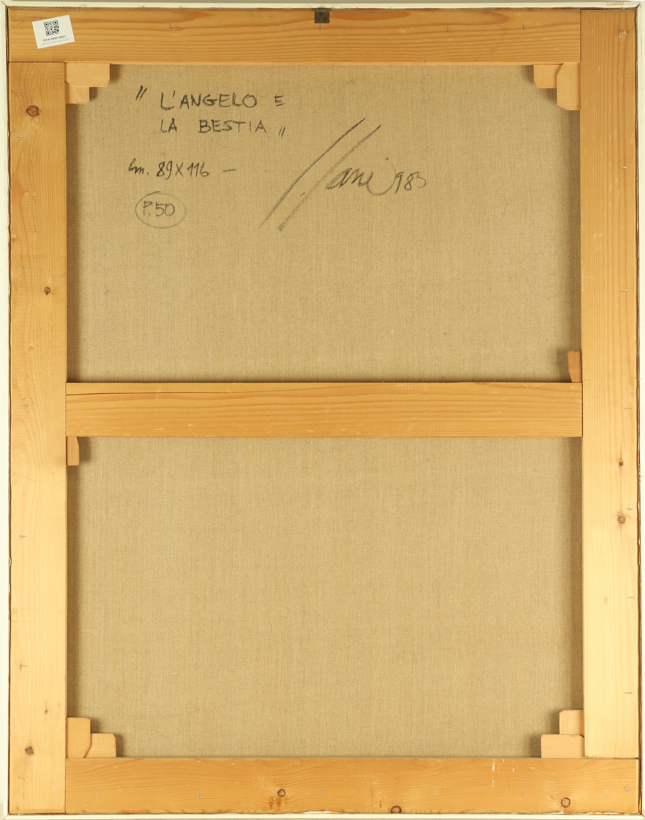SARRI SERGIO (n. 1938) L'angelo e la bestia. 1983. Acrilico su tela. Cm 89,00 x 116,00. Al retro titolo, firma e anno. Autentica dell'artista su fotografia (riporta misure errate). Pubblicazione: Catalogo ragionato Sergio Sarri a cura di Ugo Paganini e Cristiano Ragni, Overtime Art, Forì', 2009, pag. 236, tav. 621 . Cornice presente